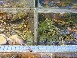 でっかい海老を食いました いやほんと、でかいんです↓右の水槽です。わかりにくいですか?緑色のヤツです。これではいかがでしょうか鮮魚屋さんの足元に注目!でっかいでしょ?ちなみにフツーの海老はこの大きさですね↓これは茹でたての熱々をガンガン殻をむしって食べますこいつが旨いんです。が、今日の主役はコイツです↓あの大海老が、こんなんなっちゃいました刺身です。このあと大海老の頭は・・・濃厚コクうまのスープにおいしい!!緑色でなんともビミョーな色だった大海老君、茹でたら赤くなりました。こんなでかいの初めてでしたが締まった肉質でうまかった~。 他にもたっくさん食べたんですが、これは大シャコ伊勢海老くらいの大きさがありました。生姜のみじん切りがアクセントになって、これも旨いこと旨いこと!揚げシャコ?でした。 さらーに、貝です。茹でたてをニンニク醤油で食べます。これも個性的でしたねニンニク効きすぎで翌日が怖かったですが しばらく海鮮は食べなくてもいいくらいの勢いで食いましたたまには食いだめもいいと思います。食いだめは脂肪も腹にたまるって? ですよねぇ。。。