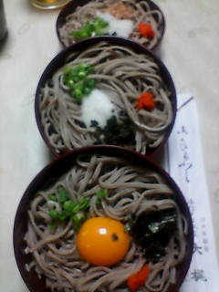 一番上(月見→とろろ→おろし)から食べて行き、残ったつゆだけ次の蕎麦にかけながらいくと、最後のおろし蕎麦には卵と山芋がミックスされた味になるわけです!(o^_^o)