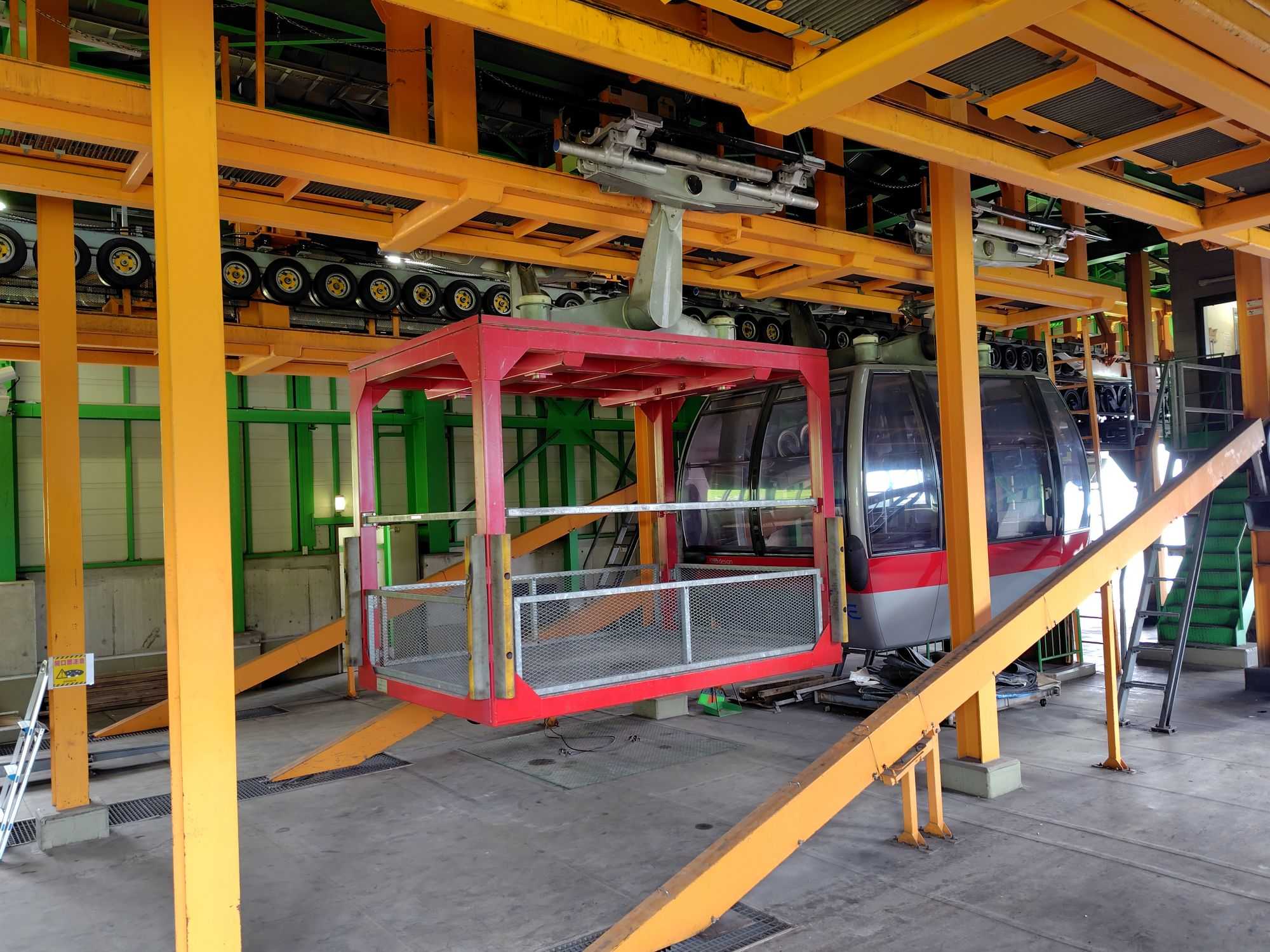 ​天神峠駅に到着。作業搬器に目が行く。箱根も蔵王もそれぞれ作業用搬器はどこも個性的です。​