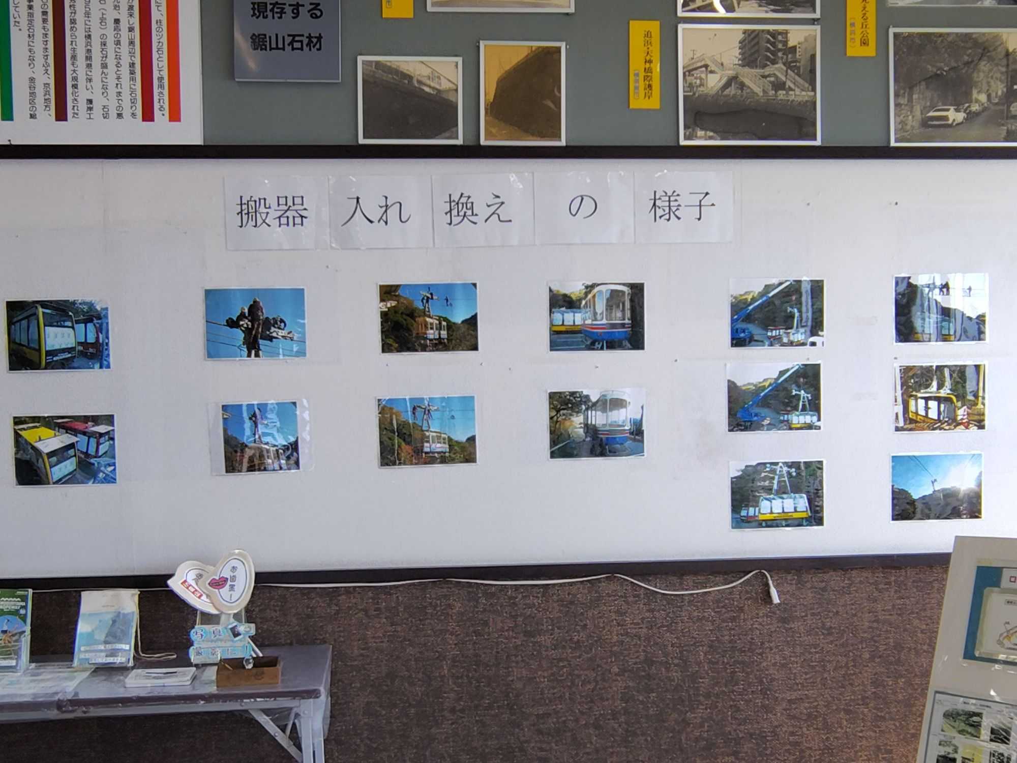 山頂駅に到着。石切資料館のところに2代目搬器から現在の3代目搬器に架け替える時の写真が展示してありました。