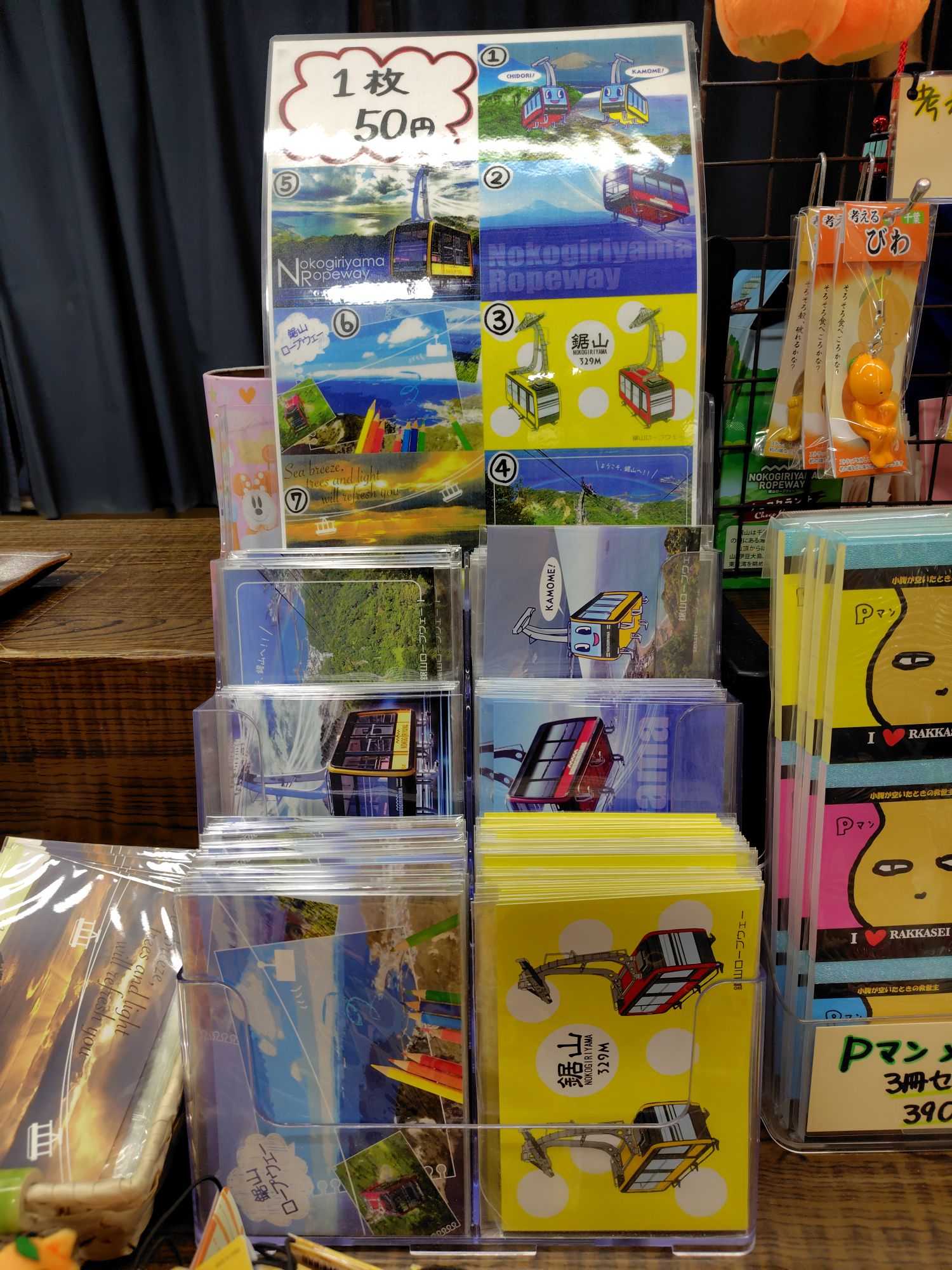 自分もお土産品チェックを!たいがいのものはすでに持っていますが、絵葉書が7種類新たに作られているじゃないですか。1枚50円。