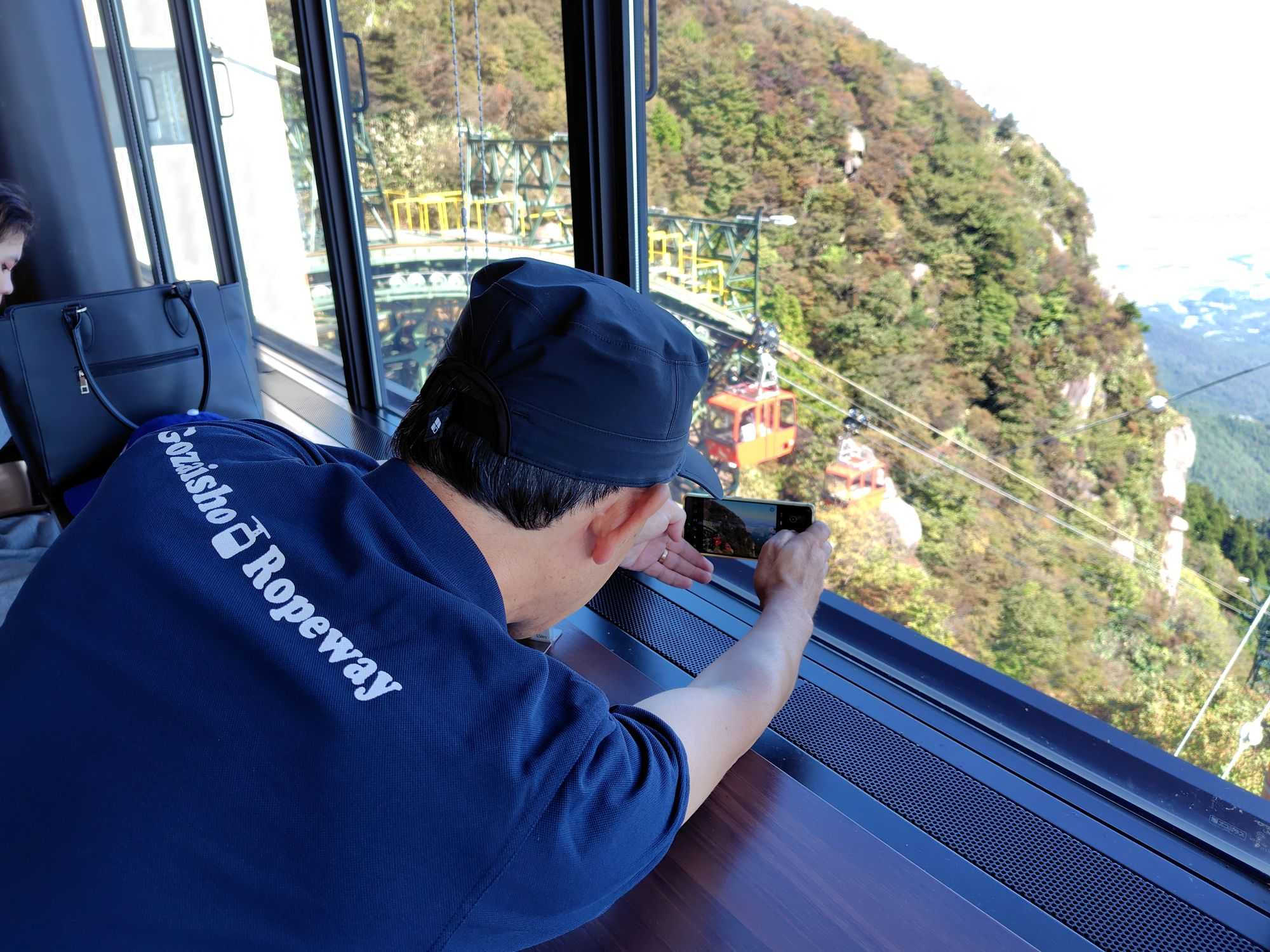 ちょうどランチタイムになったのでレストラン「ナチュール」へ。紅葉の状況をアップしなきゃと樋口さんが搬器が来るタイミングを待って撮影している姿です。