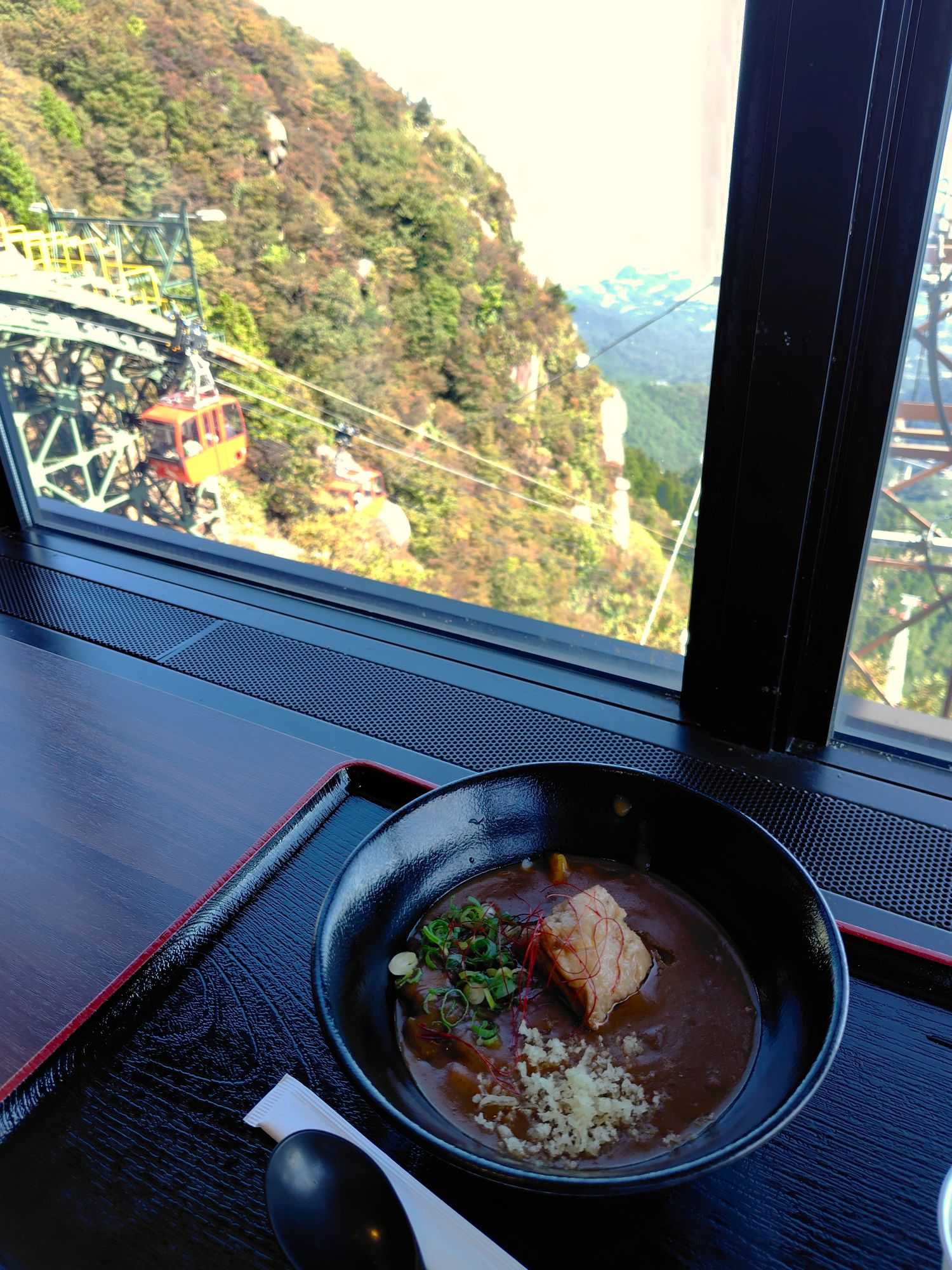 そして、御在所に来たら迷わず食べる「御在所カレーうどん」これは絶品ですから、お越しの際は食べてみてください。これをロープウェイを眺めながら食べるのが至福の時です。