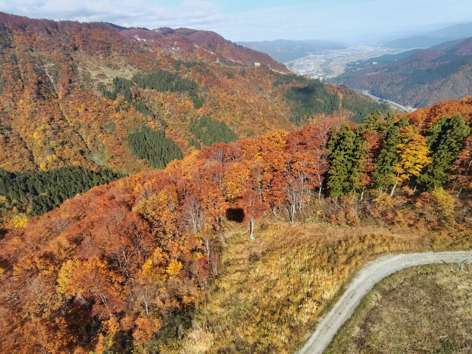 遠くにガーラ湯沢のゴンドラ、DILIGENCE(ディリジャンス)が確認でき、その奥に南魚沼の平野が見えます。