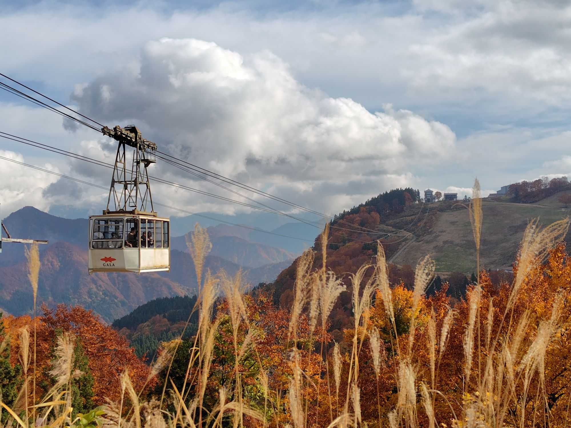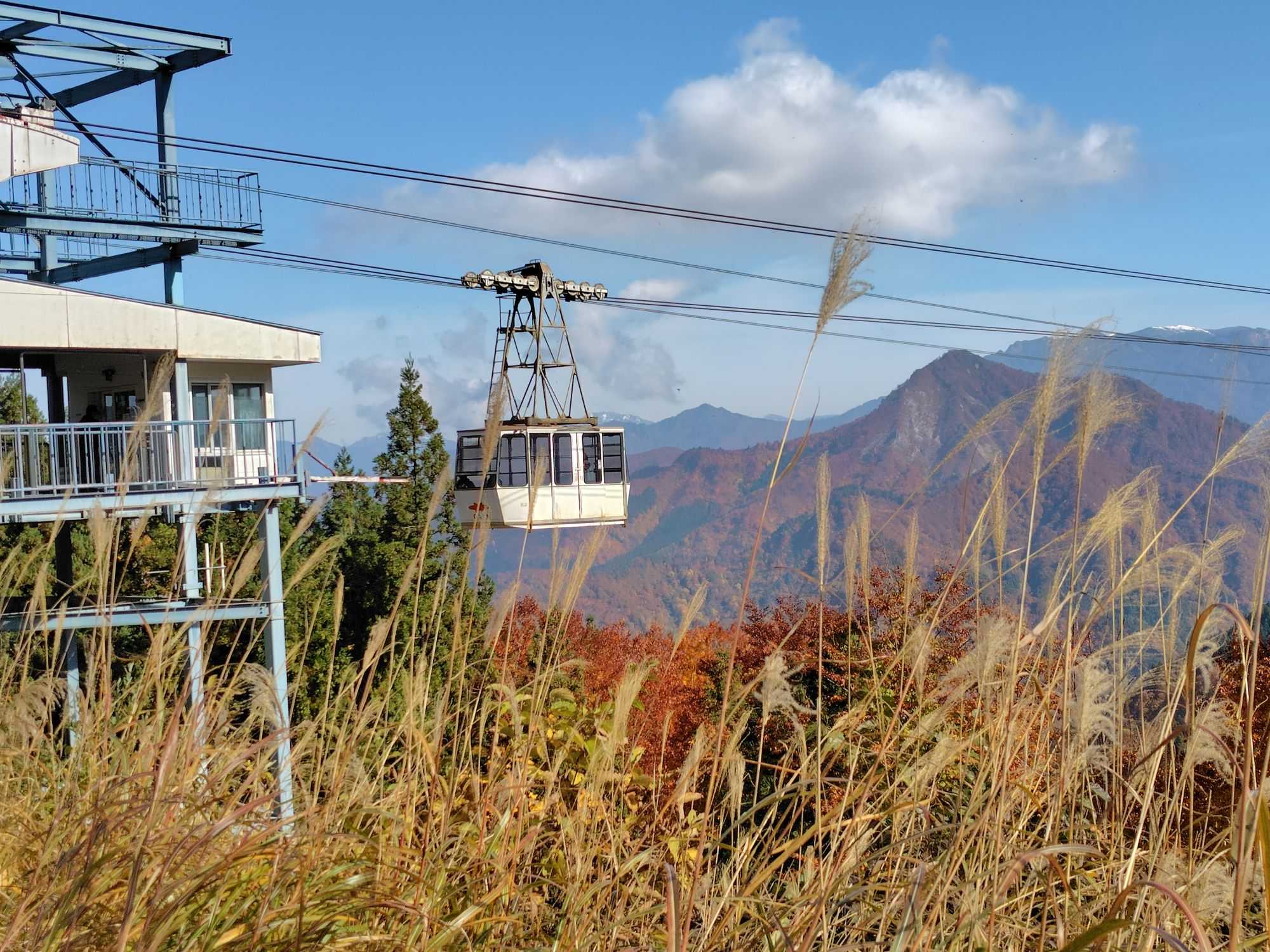 すすきと紅葉を入れると秋のロープウェイ風景が撮れます。