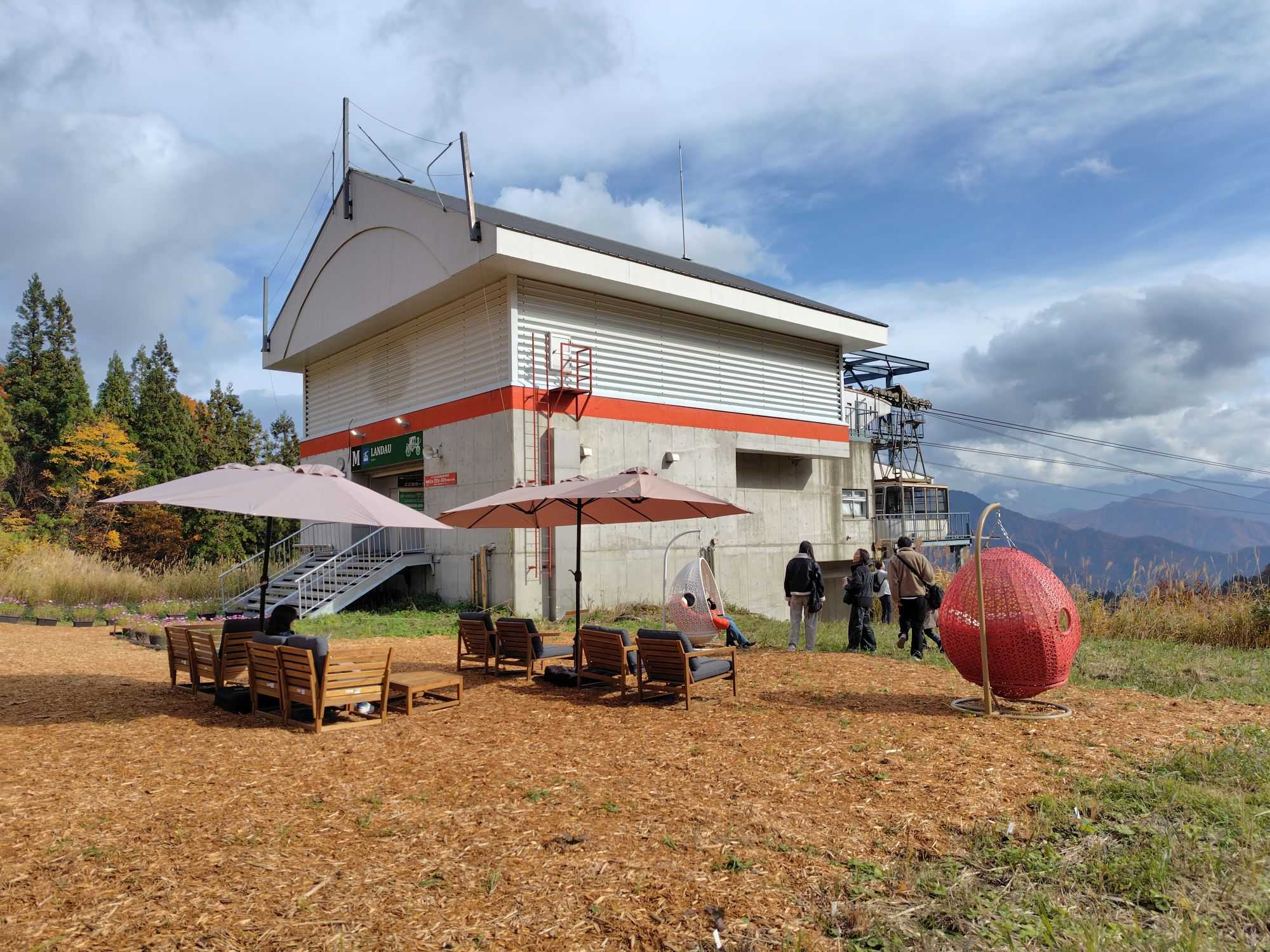 駅を出ると目の前はゲレンデ。ハンギングチェアーなどが置いてありくつろげます。