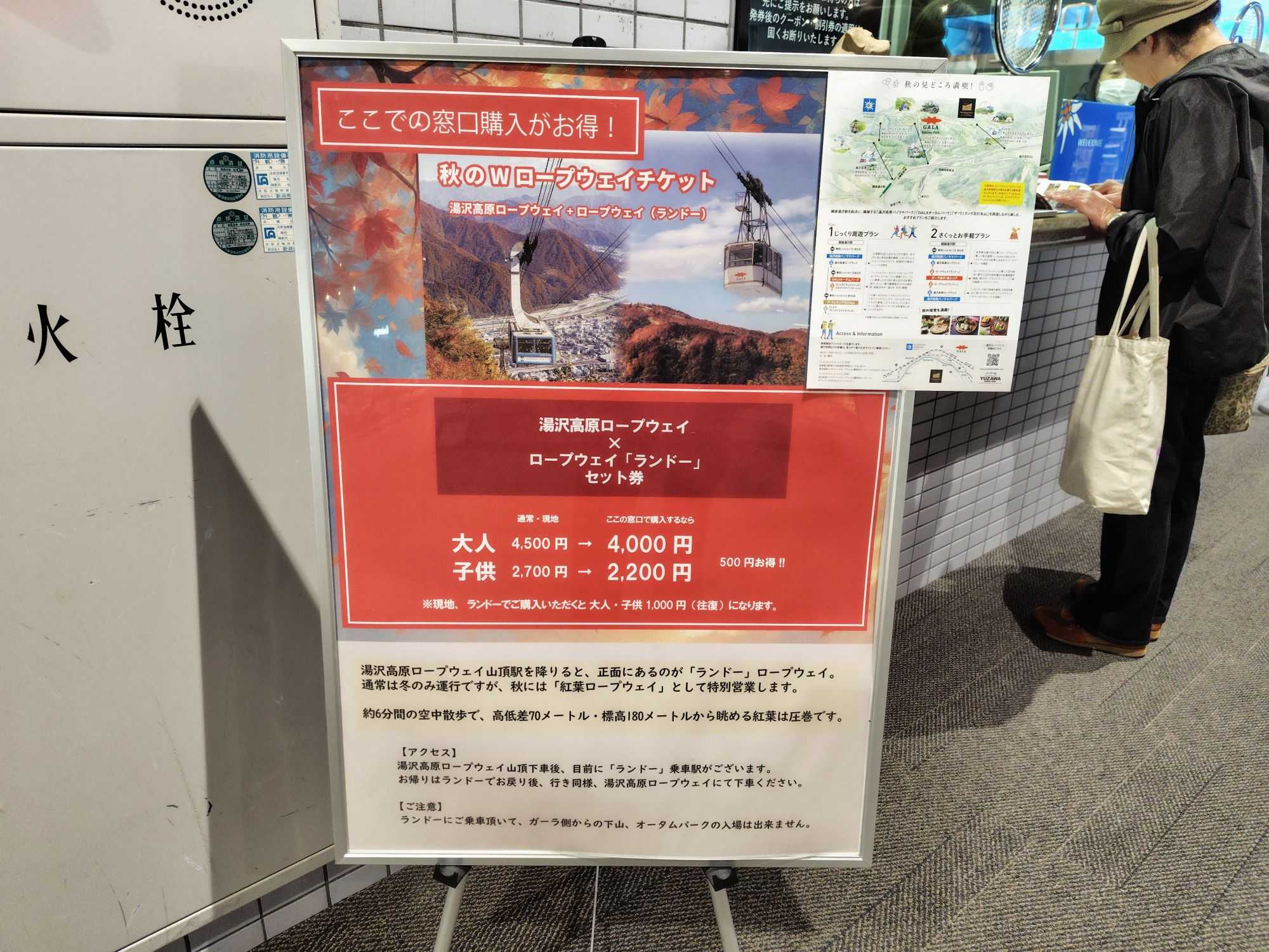 ランドーはガーラ湯沢スキー場のロープウェイですが、乗るには別会社である湯沢高原ロープウェイで山頂駅まで行く必要があります。「秋のWロープウェイチケット」が発売されていました。湯沢高原ロープウェイの往復が3500円でランドー単独の往復が1000円ですが、両方で4000円で乗れます。