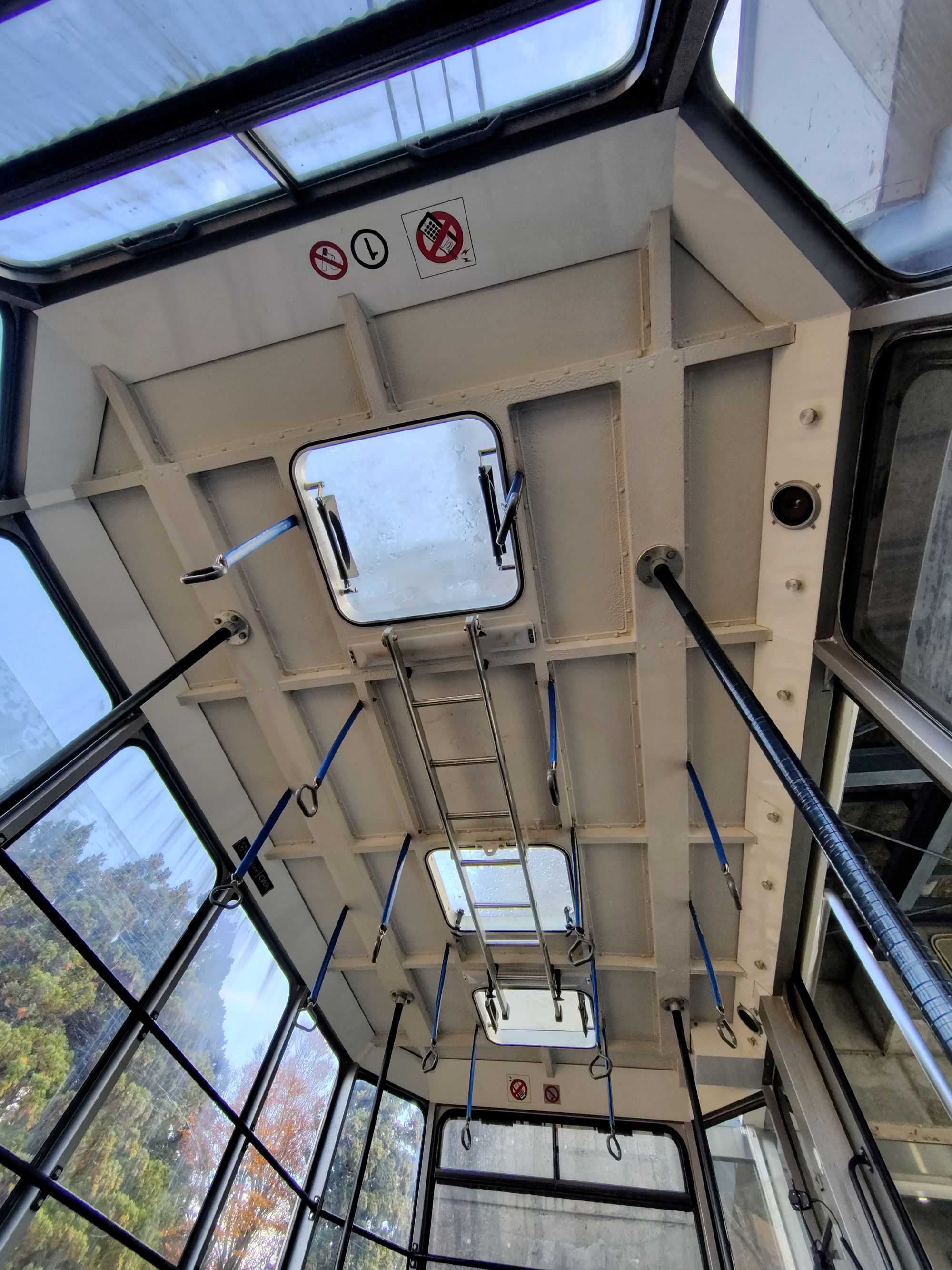 天上に天窓が3カ所ありました。スキー場のロープウェイはどうしても窓に傷が多いですが、35年経っている割には状態は悪くないと思いました。