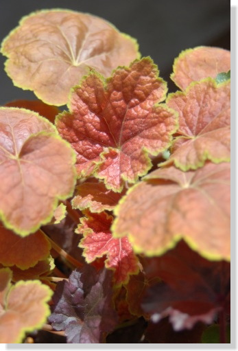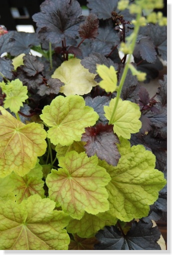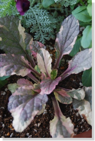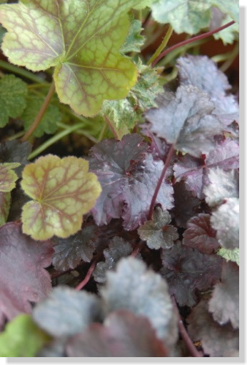 赤紫色の効いた葉っぱ深みのあるグリーンとこの赤紫が気に入って・・・アジュガ“十二単”と書いてあったので、てっきり名前かと・・別名なんですね 十二単って。【マルチカラー】という種類かしら・・そして、こちらも名脇役“ヒューケラ(ツボサンゴ)パレスパープル”表は、黒く光沢のある葉。裏が綺麗な紫色なんです。少しめくれた部分・・分かるかな~深みのある色がこの季節の寄せ植えを引き締めてくれますね・・