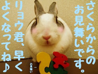 今日はいつも庭んぽをしていると 「さくらちゃ~ん♪」と遊びに来てくれる、お隣のビッキー家のリョウ君(6歳)のお見舞いに行きました。4年前に私も同じ 『扁桃腺を取る手術』 をしたのですが、本当に痛かった(x_x)手術後に高熱は出るし、痛くて水も飲めないし。。。病院は少し前に新しく立て替えられて、まるでホテルみたいでした(*^^*)大きな吹き抜けがあって、エレベーターも照明もオシャレでびっくり!!もしかしたら、痛くて泣いているかもと思っていたけど。。。リョウ君は全く平気なようでした。大人になってからと子供の頃に手術するのとでは、痛さが全く違うそうです。「さくらちゃんは?」 と元気いっぱいでした~(^-^*) 画像掲示板はコチラ。 ← 「一日一ポチ。」お願いします(*^_^*)(=^-^=) 日本マフマフ党のマニフェストは以下の通りである。。。●マフマフ(又は毛並み)を見るだけで相手を幸せにする!●たくさんのうさぎ好きさんを増やすために貢献する!●換毛期のブラッシングは大切にする!日本マフマフ党名簿はコチラからです。現在40ウサちゃんが参加中です(=^-^=)ノ☆「日本マフマフ党」は引き続き党員を募集中です(男の子も大歓迎)!!・党員名簿用の写真・お名前・誕生日・女の子or男の子・熱意を一言 是非とも!と思われるウサギさんはコチラの画像掲示板にお願いします。