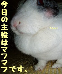 今日の主役は 『マフマフ』 です (=^-^=)ノカメラ目線で絶好のシャッターチャンスだったのに。。。思い切りブレてしまいました。。。(-_-)でも、たまにはこんな写真もおもしろいかなぁ (^0^*)★日本マフマフ党に党員no.37 リオくん&党員no.38 リンちゃんが仲間入りしました★ 画像掲示板はコチラ。 ← 「一日一ポチ。」お願いします(*^_^*)(=^-^=) 日本マフマフ党のマニフェストは以下の通りである。。。●マフマフ(又は毛並み)を見るだけで相手を幸せにする!●たくさんのうさぎ好きさんを増やすために貢献する!●換毛期のブラッシングは大切にする!日本マフマフ党名簿はコチラからです。現在38ウサちゃんが参加中です(=^-^=)ノ☆「日本マフマフ党」は引き続き党員を募集中です(男の子も大歓迎)!!・党員名簿用の写真・お名前・誕生日・女の子or男の子・熱意を一言 是非とも!と思われるウサギさんはコチラの画像掲示板にお願いします。