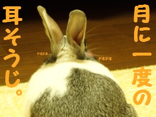 「耳そうじ」 をどのくらいの頻度していますか??さくらは1ヶ月に一度くらい (=^-^=)ノ綿棒に微妙に湿らせたティッシュを巻き付けて、軽く拭き取る程度のそうじです。でも、意外に汚れてる o(*'o'*)o毎日べらんぽをするので、汚れて当然ですが。。。そうじ後、必ず足を使って耳を掻いている姿が可愛いくて笑っちゃいます(*^0^*) 画像掲示板はコチラ。 ← 「一日一ポチ。」お願いします(*^_^*)(=^-^=)日本マフマフ党のマニフェストは以下の通りである。。。●マフマフ(又は毛並み)を見るだけで相手を幸せにする!●たくさんのうさぎ好きさんを増やすために貢献する!●換毛期のブラッシングは大切にする!日本マフマフ党名簿はコチラからです。現在40ウサちゃんが参加中です(=^-^=)ノ☆「日本マフマフ党」は引き続き党員を募集中です(男の子も大歓迎)!!・党員名簿用の写真・お名前・誕生日・女の子or男の子・熱意を一言 是非とも!と思われるウサギさんはコチラの画像掲示板にお願いします。