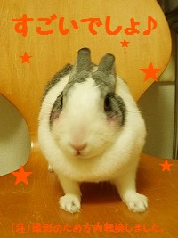 明けましておめでとうございます (=^-^=)ノ今年の目標は。。。(=^-^=) さくらは 『健康第一』 です。(*^_^*) さくら2/18は 『出会い』 をもっと大切にしていきたいと思います。本年もどうぞ宜しく願いします~♪ 画像掲示板はコチラ。 ← 「一日一ポチ。」お願いします(*^_^*)(=^-^=) 日本マフマフ党のマニフェストは以下の通りである。。。●マフマフ(又は毛並み)を見るだけで相手を幸せにする!●たくさんのうさぎ好きさんを増やすために貢献する!●換毛期のブラッシングは大切にする!日本マフマフ党名簿はコチラからです。現在32ウサちゃんが参加中です(=^-^=)ノ☆「日本マフマフ党」は引き続き党員を募集中です(男の子も大歓迎)!!・党員名簿用の写真・お名前・誕生日・女の子or男の子・熱意を一言 是非とも!と思われるウサギさんはコチラの画像掲示板にお願いします。