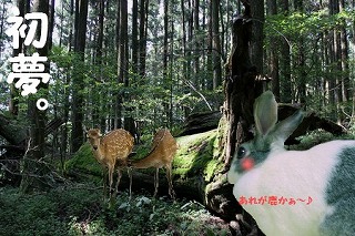 な、なんとっ、人生で初めての初夢を見ました~(^0^*)ノ昨日、++moco.moco++さんの日記を読んだからかなぁ。。。夢の中で さくら(=^-^=)、さくら2/18(*^_^*)、もう一人( ^_^ )の3人で山道をドライブして、鹿の親子に会いに行きました。そして、三脚を使って全員で記念撮影。とても可愛い親子でした(*^^*) 画像掲示板はコチラ。 ← 「一日一ポチ。」お願いします(*^_^*)(=^-^=) 日本マフマフ党のマニフェストは以下の通りである。。。●マフマフ(又は毛並み)を見るだけで相手を幸せにする!●たくさんのうさぎ好きさんを増やすために貢献する!●換毛期のブラッシングは大切にする!日本マフマフ党名簿はコチラからです。現在32ウサちゃんが参加中です(=^-^=)ノ☆「日本マフマフ党」は引き続き党員を募集中です(男の子も大歓迎)!!・党員名簿用の写真・お名前・誕生日・女の子or男の子・熱意を一言 是非とも!と思われるウサギさんはコチラの画像掲示板にお願いします。