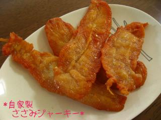 僭越ながら、『ささみジャーキー』と『クリスピーチキン』のレシピ&作り方をUPさせて頂きます~(^_^;)超が付くほど簡単ですので、もし宜しければチャレンジしてみて下さいませ《ささみジャーキー》【材 料】・鶏ささ身【作り方】1.ささ身を2枚に下ろす。(スジは取っても取らなくても)2.2~3ミリくらいの薄さに伸ばす。3.焼き網にクッキングシートを敷いてささ身を並べ、170℃~180℃のオーブンで40分程乾燥焼きする。4.途中裏返しながら乾燥焼きして下さい。*薄い程焦げやすいので色づき始めたら目を離さないように。*冷める程水分が蒸発してどんどん硬くなるので、ワンコのお好みにより厚さ・焼き時間は調節して下さい。*完成後は冷蔵庫で保管し、早めに消費して下さい。*下ろさずに、そのまま伸ばして巨大ジャーキーを作っても面白いかも(笑)*人間のおつまみとして、伸ばしたささ身に塩コショウして、ガーリックパウダーやカレーパウダー、おろしニンニク、チーズ等々をまぶして焼いても最高です*追記*オーブン・レンジ・トースター何でも焼けます。要はじっくり乾燥焼きをさせれば良いと思います。焼きが足りないと思ったら、時間を追加して下さい♪焦げ付きには注意して下さいね♪ 《クリスピーチキン》【材 料】・鶏ささ身【調味料】(下味)・お酒――――――大2~3・醤油――――――大2~3・にんにく――――-1片(揚げ衣)・小麦粉―――――1カップ・パン粉―――――1カップ・卵―――――――1個・水―――――――70cc・塩―――――――少々・重曹(タンサン)―――大1【作り方】1.ささ身はスジを取り、大きければタテ半分に切っても良いですし、そのままでも2.1のささ身に下味の調味料を揉み込む。3.ボールに揚げ衣の材料を全部入れて混ぜる。4.3に2のささ身を入れて衣をよく絡ませる。5.油を160℃に熱し、2~3分揚げたら一度取り出し、温度を180℃~190℃に上げて、カラッと2度揚げして完成。*衣が緩そうだったらパン粉で調節して下さい。*揚げる直前に衣を作るとパン粉もしっかりしていて良いかと思います。*下味はしっかり付け、出来れば1時間程じっくり漬け込むといいかも。 あくまでも自己流なので、ご家庭のお好みによりアレンジして美味しいの作って下さいねまた、こうしたら美味しかったよ~という事がありましたら、是非教えて下さい
