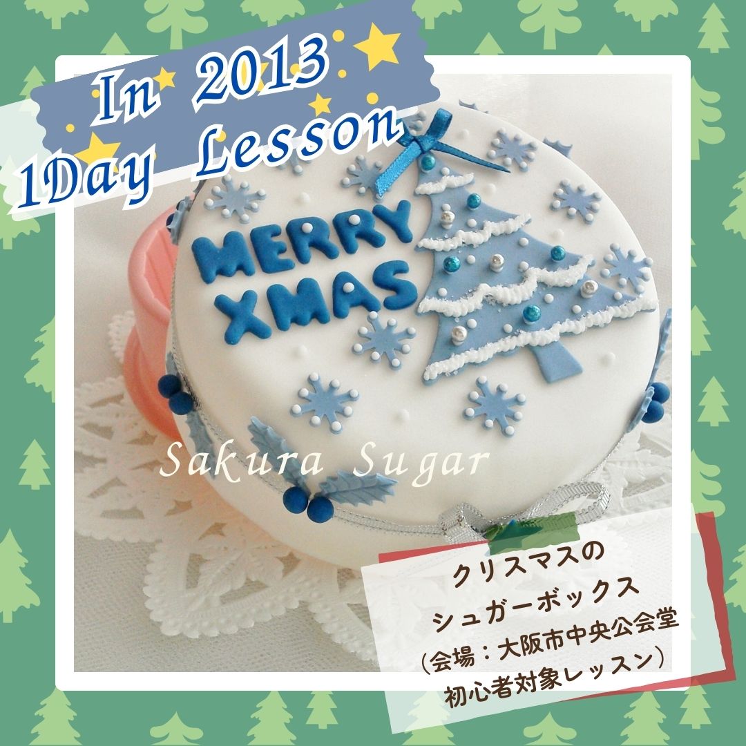 アトリエ開設15周年記念過去の懐かし~い~単発のミニレッスンの作品集パートⅢ 冬バージョン!!(レギュラーレッスン除く)懐かしのものを少しだけアップさせていただきます!!【パート17】こちらは、2013年に大阪市中央公会堂で初心者対象で1日講座として開講しました時の「クリスマスのシュガーボックス」です。フタが開くので中にお菓子など入れることが出来るボックスです。器側はプラスチックになっているので、丈夫です。プレゼントに最適なものです。こちらのシュガーボックスシリーズは、プレゼント用として当教室内では、当時は人気があった作品の1つです。懐かし~~~いです。~*~*~メッセージ~*~*~いつもご愛顧頂きまして、本当にありがとうございます!!おかげさまで、さくらしゅがー館は、2005年からスタートさせていただき、来年で20周年を迎えることになり、2009年から現在の東大阪にアトリエ・教室を開設することになり、15周年を迎えることになりました。これもひとえに教室の生徒の皆様及び皆々様のお陰と深く感謝しております。これからも皆様に喜んでいただける教室にしていきたいと思っております。今後ともなにとぞ、ご支援ご愛顧を賜りますよう宜しくお願い申し上げます。