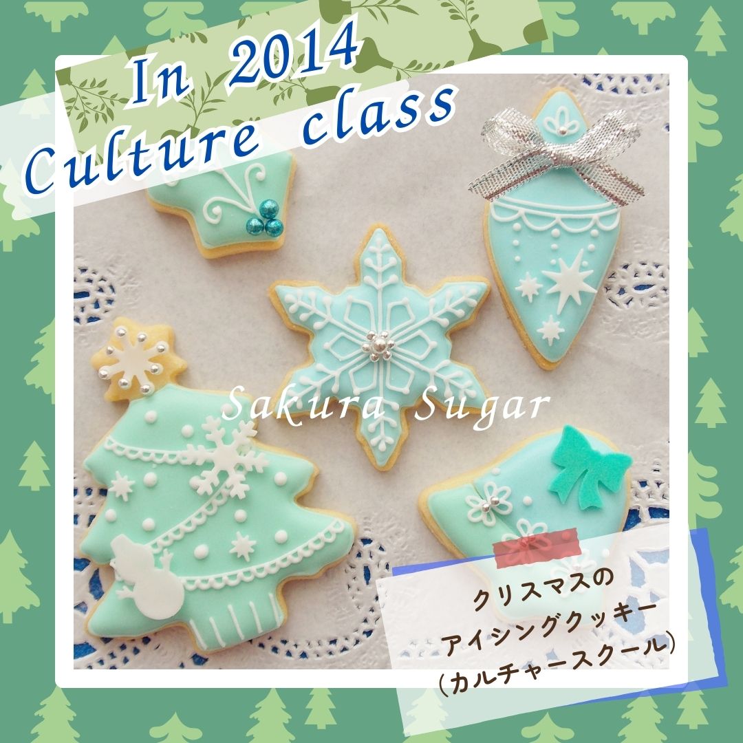 アトリエ開設15周年記念過去の懐かし~い~単発のミニレッスンの作品集パートⅢ 冬バージョン!!(レギュラーレッスン除く)懐かしのものを少しだけアップさせていただきます!!【パート19】こちらは、2014年にカルチャーの1日レッスンで開講しました時の「クリスマスのアイシングクッキー」です。こちらは大人の方向き初心者対象のレッスンで1時間半位で簡単に作っていただけるアイシングクッキーです。クッキーの土台は講師が焼いたものです。完成後はお召し上がりいただけます。懐かし~~~いです。~*~*~メッセージ~*~*~いつもご愛顧頂きまして、本当にありがとうございます!!おかげさまで、さくらしゅがー館は、2005年からスタートさせていただき、来年で20周年を迎えることになり、2009年から現在の東大阪にアトリエ・教室を開設することになり、15周年を迎えることになりました。これもひとえに教室の生徒の皆様及び皆々様のお陰と深く感謝しております。これからも皆様に喜んでいただける教室にしていきたいと思っております。今後ともなにとぞ、ご支援ご愛顧を賜りますよう宜しくお願い申し上げます。