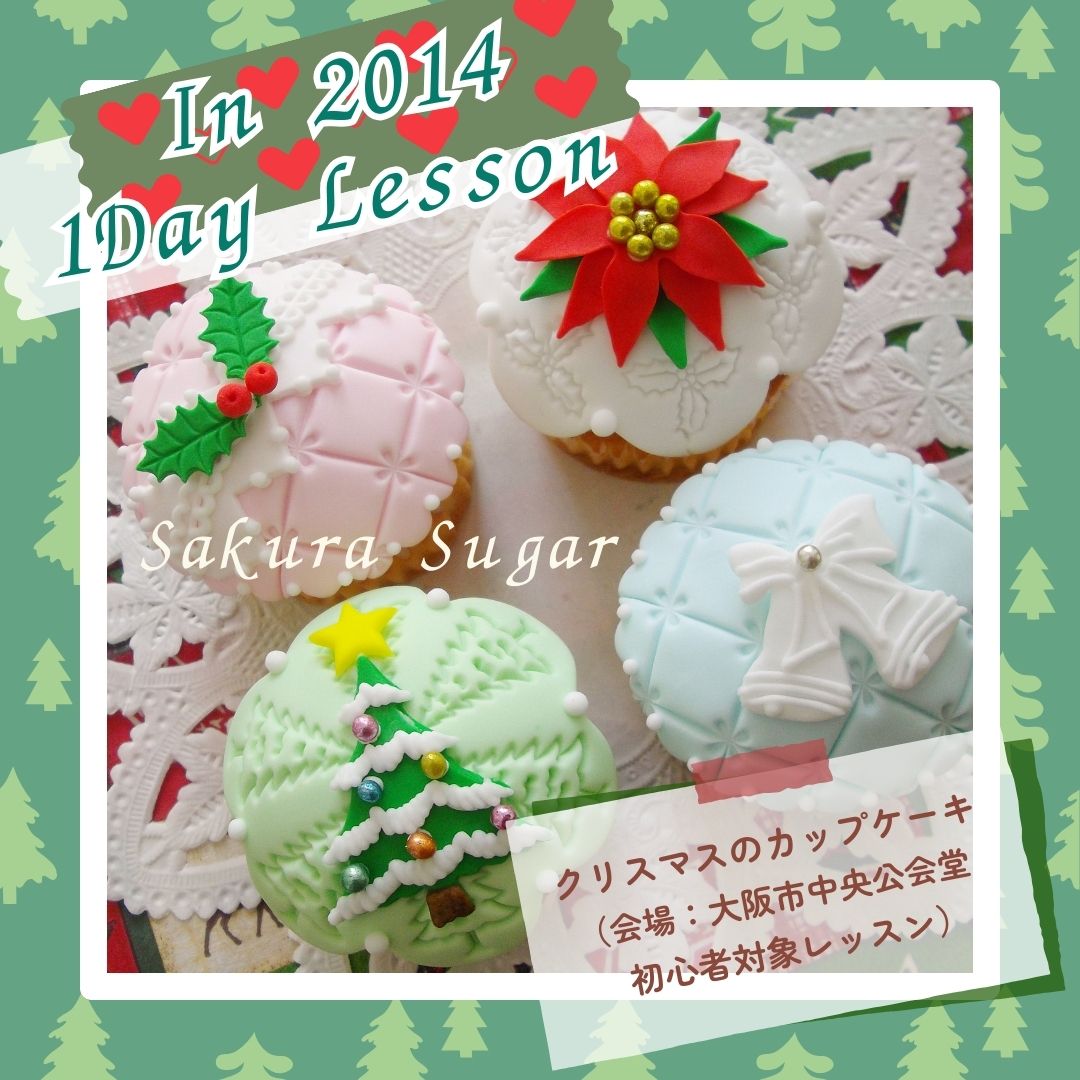 アトリエ開設15周年記念過去の懐かし~い~単発のミニレッスンの作品集パートⅢ 冬バージョン!!(レギュラーレッスン除く)懐かしのものを少しだけアップさせていただきます!!【パート20】こちらは、2014年に大阪市中央公会堂で1日講座として開講しました時の「クリスマスのカップケーキ」です。こちらは大人の方向き初心者対象のレッスンでカップケーキをシュガーペーストとアイシングでデコレーションしていただきます。完成後は、お召し上がりいただけます。プレゼント用としても最適です。懐かし~~~いです。~*~*~メッセージ~*~*~いつもご愛顧頂きまして、本当にありがとうございます!!おかげさまで、さくらしゅがー館は、2005年からスタートさせていただき、来年で20周年を迎えることになり、2009年から現在の東大阪にアトリエ・教室を開設することになり、15周年を迎えることになりました。これもひとえに教室の生徒の皆様及び皆々様のお陰と深く感謝しております。これからも皆様に喜んでいただける教室にしていきたいと思っております。今後ともなにとぞ、ご支援ご愛顧を賜りますよう宜しくお願い申し上げます。