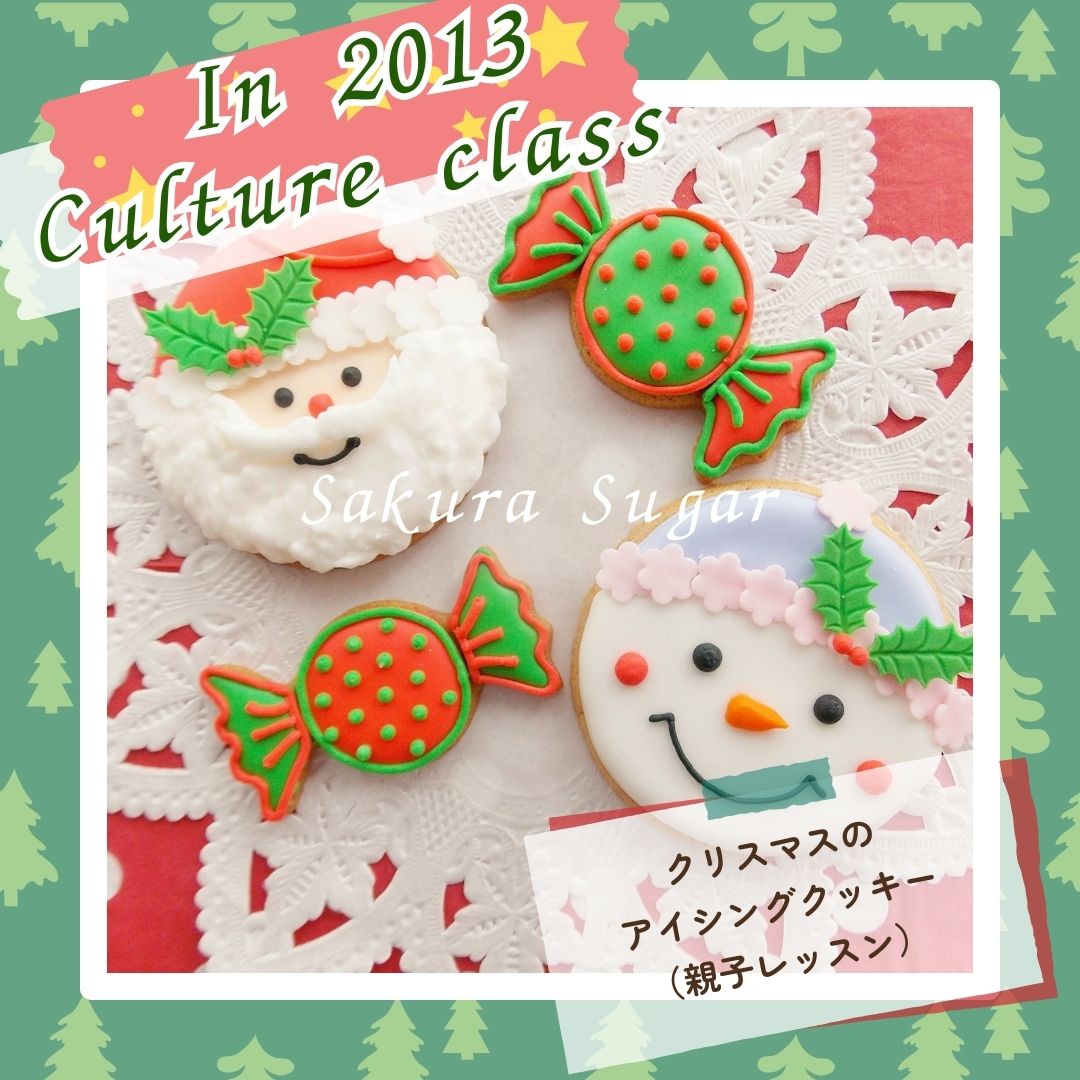 アトリエ開設15周年記念過去の懐かし~い~単発のミニレッスンの作品集パートⅢ 冬バージョン!!(レギュラーレッスン除く)懐かしのものを少しだけアップさせていただきます!!【パート18】こちらは、2013年にカルチャーの親子レッスンで開講しました時の「クリスマスのアイシングクッキー」です。小さなお子様ご対象で1時間半位で簡単に作っていただけるアイシングクッキーです。クッキーの土台は講師が焼いたものです。完成後はお召し上がりいただけます。懐かし~~~いです。~*~*~メッセージ~*~*~いつもご愛顧頂きまして、本当にありがとうございます!!おかげさまで、さくらしゅがー館は、2005年からスタートさせていただき、来年で20周年を迎えることになり、2009年から現在の東大阪にアトリエ・教室を開設することになり、15周年を迎えることになりました。これもひとえに教室の生徒の皆様及び皆々様のお陰と深く感謝しております。これからも皆様に喜んでいただける教室にしていきたいと思っております。今後ともなにとぞ、ご支援ご愛顧を賜りますよう宜しくお願い申し上げます。
