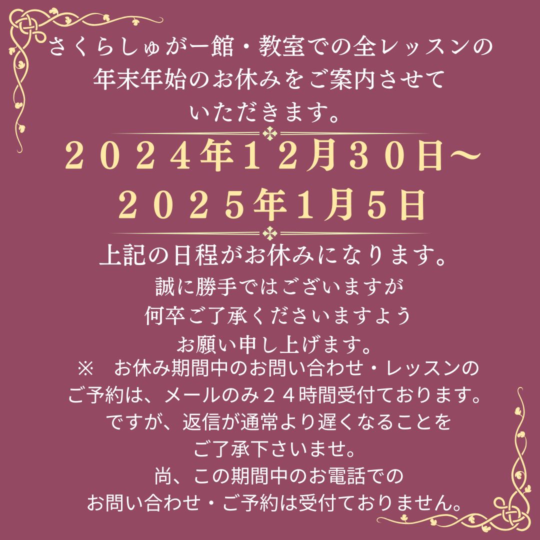 本年中の御愛顧に心より御礼申し上げますとともに、来年 2025年も変わらぬお引き立てのほど宜しくお願い申し上げます。皆様、よいお年をお迎えくださいませ。2024年12月 さくらしゅがー館 櫻井真貴子*~*~*~*~*~*~*~*~*~*~*~*