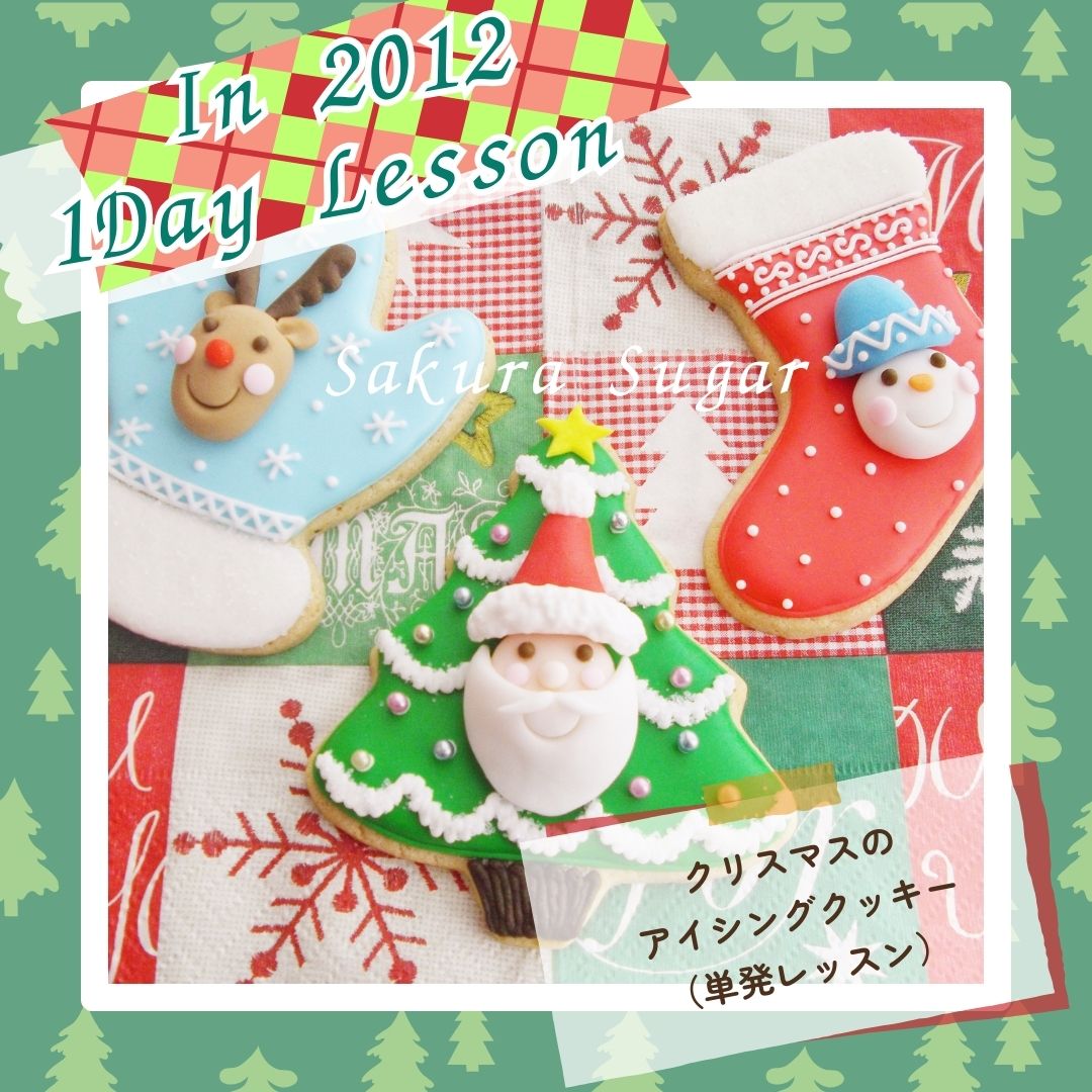 アトリエ開設15周年記念過去の懐かし~い~単発のミニレッスンの作品集パートⅢ 冬バージョン!!(レギュラーレッスン除く)懐かしのものを少しだけアップさせていただきます!!【パート16】こちらは、2012年頃~当教室内で単発レッスンとして開講しました時の「クリスマスのアイシングクッキー」です。クッキーは講師が手作りで焼いております。クッキーの上にはアイシングだけではなく、シュガーペーストで作るサンタさん・雪だるまさん・トナカイさんを作って接着します。一つが割と大き目のクッキーです。完成後はお召し上がりいただけます。懐かし~~~いです。~*~*~メッセージ~*~*~いつもご愛顧頂きまして、本当にありがとうございます!!おかげさまで、さくらしゅがー館は、2005年からスタートさせていただき、来年で20周年を迎えることになり、2009年から現在の東大阪にアトリエ・教室を開設することになり、15周年を迎えることになりました。これもひとえに教室の生徒の皆様及び皆々様のお陰と深く感謝しております。これからも皆様に喜んでいただける教室にしていきたいと思っております。今後ともなにとぞ、ご支援ご愛顧を賜りますよう宜しくお願い申し上げます。