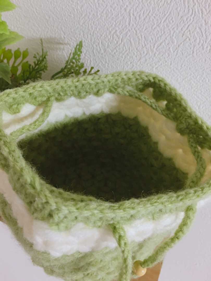 グリーンの紐は同じ毛糸で。