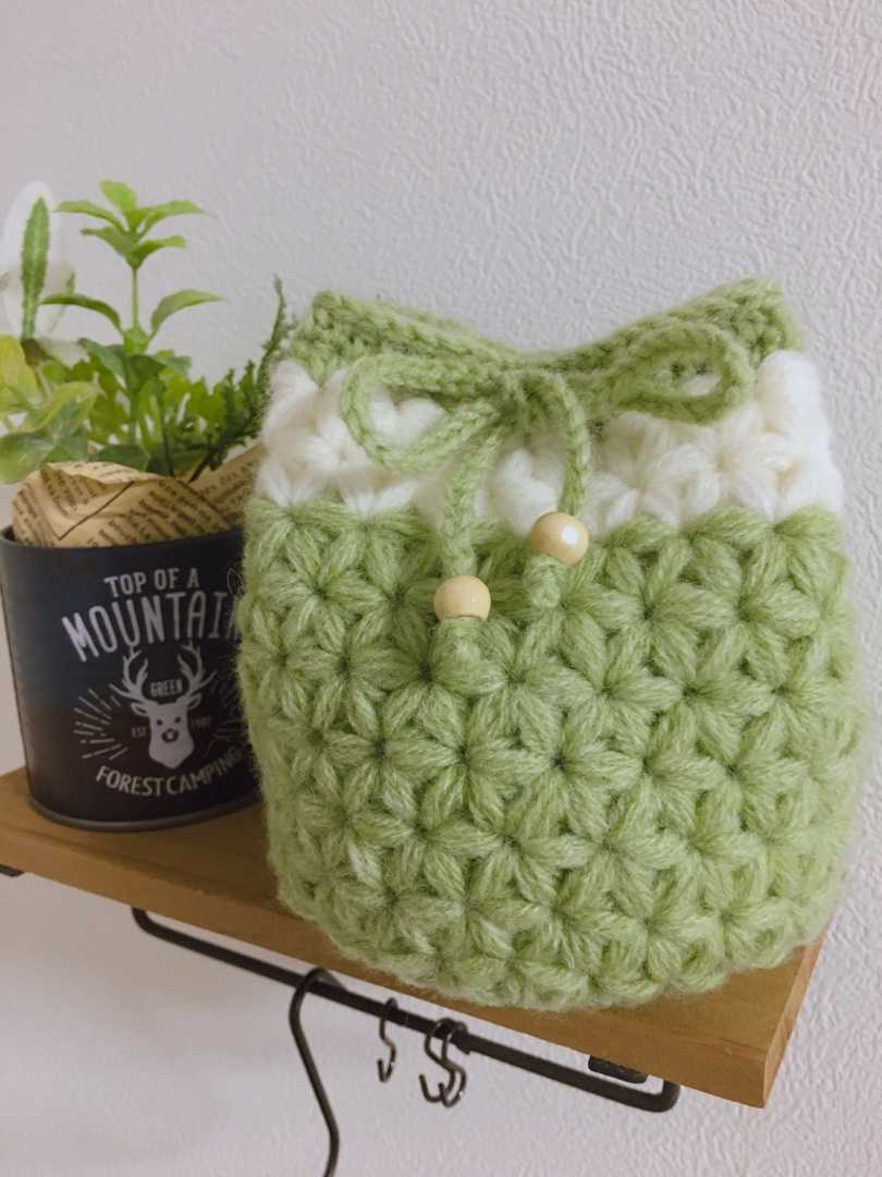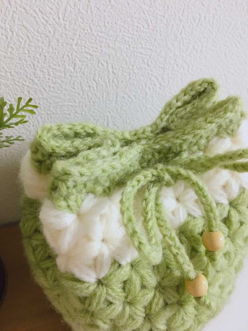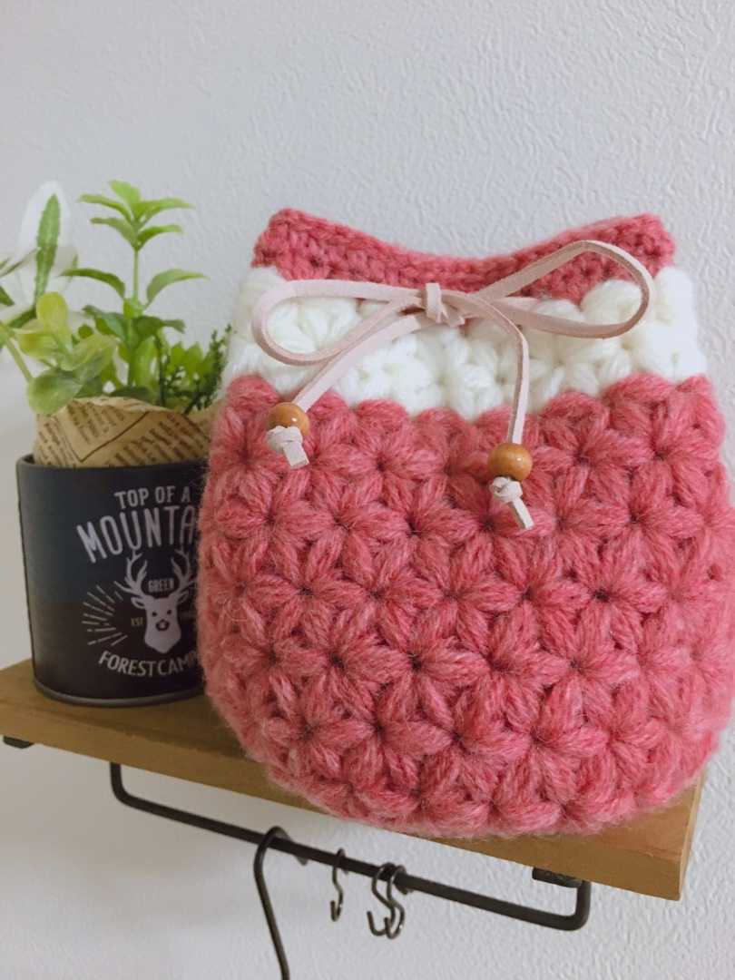 リフ編みで編んだ巾着袋です。
