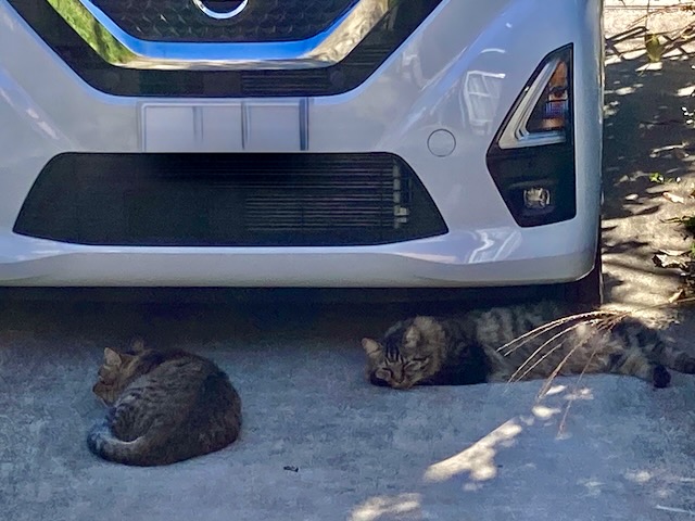 ニャンズは車の前で