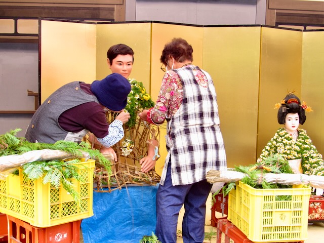 あっ、菊人形の着せ替えをしています。