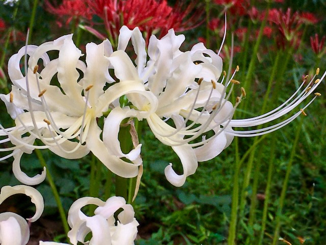 二週間前ぐらいまでこんなに美しく艶やかに咲いていた「彼岸花」の花。燃えるように真っ赤な彼岸花も素晴らしく良いですがその中に、真っ白な彼岸花を見つけるととっても有難いように思ってしまいます。さて、そのお彼岸から二週間以上が経ち十五夜を迎え、満月を迎えて寒露も迎えました。今日は以前だったら「体育の日」です。東日本、関東はすっかり秋らしくなって最高気温が25度にも達しません。肌寒いくらいです。厚手の毛布を天日に干しました。ニャンズは車の前で仲良くお昼寝です。美しかった彼岸花は今は、こんな具合になっています。美しさは長続きしない‥の典型とも言えそうですね。こうして彼岸花の花は花びらは朽ち果て茎は折れ曲がり地面の中に消えてゆきます。そして、折れて果てた茎の下から濃い緑色の葉が出て来ます。写真の左下に出ている細い葉が彼岸花の葉っぱです。これが秋から真冬にかけてどんどん大きく成長します。あの赤い花なら曼珠沙華の面影は全く消え失せてしまいます。雨が降らない内に少し庭木の刈り込みでもしましょうかね〜明日からしばらくお天気が荒れ模様になるかもにほんブログ村にほんブログ村