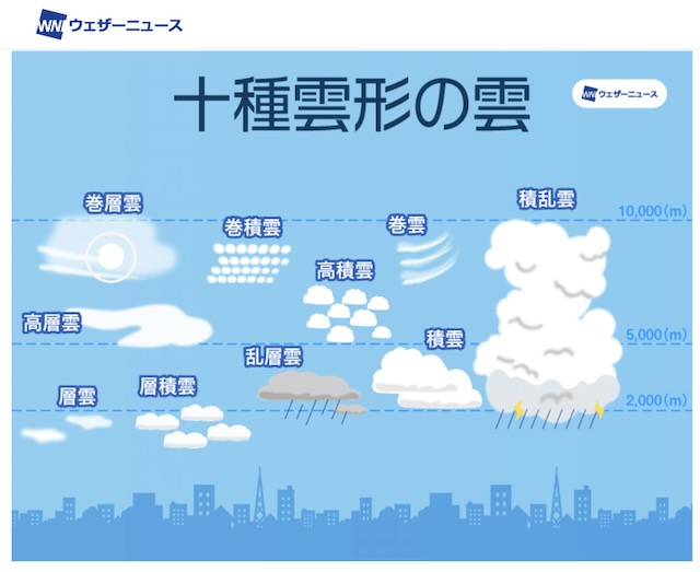 秋らしくなりましたね。「秋の雲」今日は「雲」のお話。空に浮かぶ雲は、地面からの高さや形から10種類に分けられ、それぞれに名前がつけられています。上のイラストもこれから書く文章もウェザーニュースからの引用です。「それぞれの雲の名前」・巻雲(けんうん)→すじぐも・巻積雲(けんせきうん)→うろこぐも・巻層雲(けんそううん)→うすぐも・高積雲(こうせきうん)→ひつじぐも・高層雲(こうそううん)→おぼろぐも・乱層雲(らんそううん)→あまぐも・層積雲(そうせきうん)→うねぐも・層雲(そううん)→きりぐも・積雲(せきうん)→わたぐも・積乱雲(せきらんうん)→にゅうどうぐも 雲の種類をよく見ると「層」や「積」のつく雲が多いことが分かります。「層」のつく雲はのっぺりと広がっていて、平らな感じがする雲。「積」のつく雲はモコモコしていて、空高くのびていくような雲。という具合に雲にもいろいろな形や高さがあるのです。昨日の夕方近くにそれは美しい雲に出会いました。全て、巻積雲(鱗雲、鰯雲)です。まずは「東の空」から秋を感じますね。西側の雲は太陽との光の関係でもっと美しいです。東も南も西もこんな具合で空いっぱいに広がった鰯雲。だんだん暮れなずんでくるとその色の変化に魅入ってしまうほど美しい。そして、日が落ちる頃にはこの雲たちはどこかに姿を消してしまいます。にほんブログ村