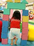 夜、買い物をしにイトーヨーカドーへ行きました。子供服やおもちゃを売っているところに、子供の遊ぶスペースがあります。みゆが行きたがったので遊ばせました。↓パパが作った門?をくぐってブロック(って言うのかしら)を黙々と重ねてます。 そしてまた門をくぐろうとしたとき・・・ 門が崩れてしまいました・・・。また重ね始めました。 最後には飽きて、ブロックに乗って遊んでました。(笑)
