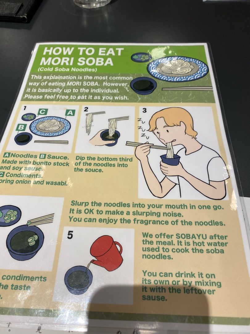 ↓店内にあった「How to eat MORI SOBA」。ズズズと音を立てて食べるのがコツ。大事な案内ですね。