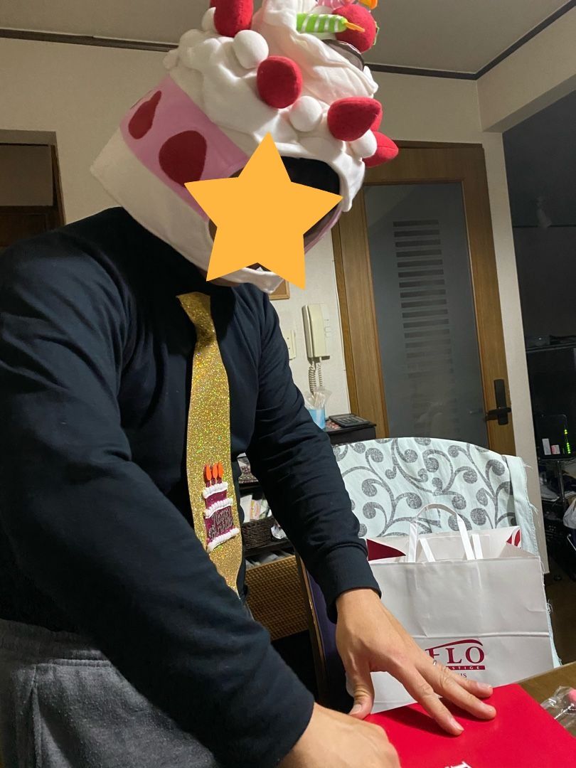 ご飯を食べ終えたところ、ケーキのかぶり物をきた旦那さんがお祝いをしてくれました。