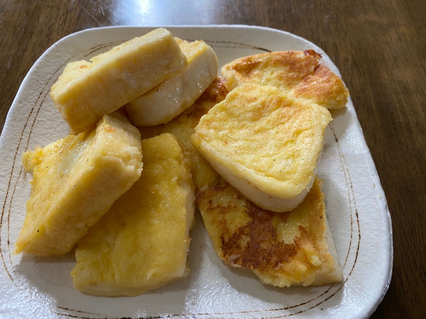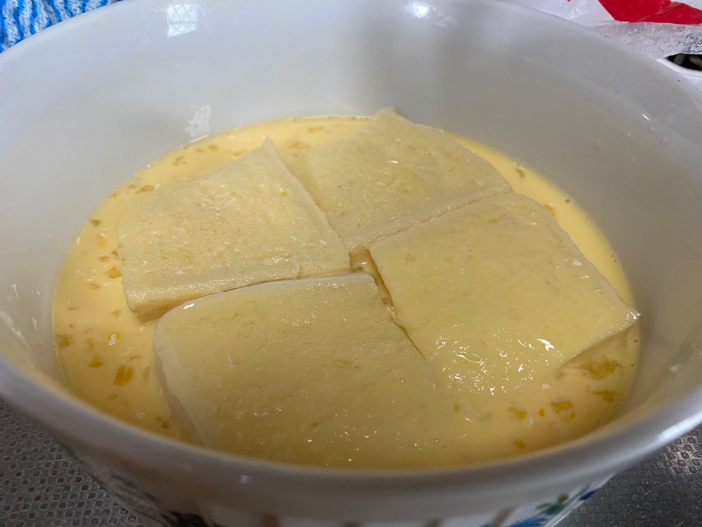 ↓牛乳、お砂糖、卵をまぜたところに食パンを浸して、弱火でじっくり焼きます。めちゃくちゃ簡単!!