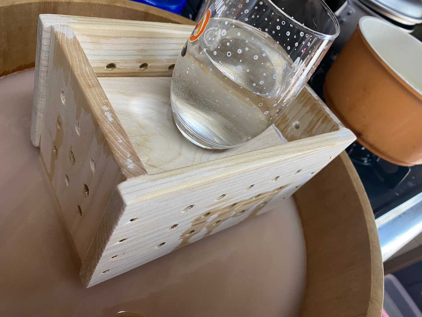 ↓その後、上蓋をのせて、水が入ったコップを重しとして乗せて20分おきます。