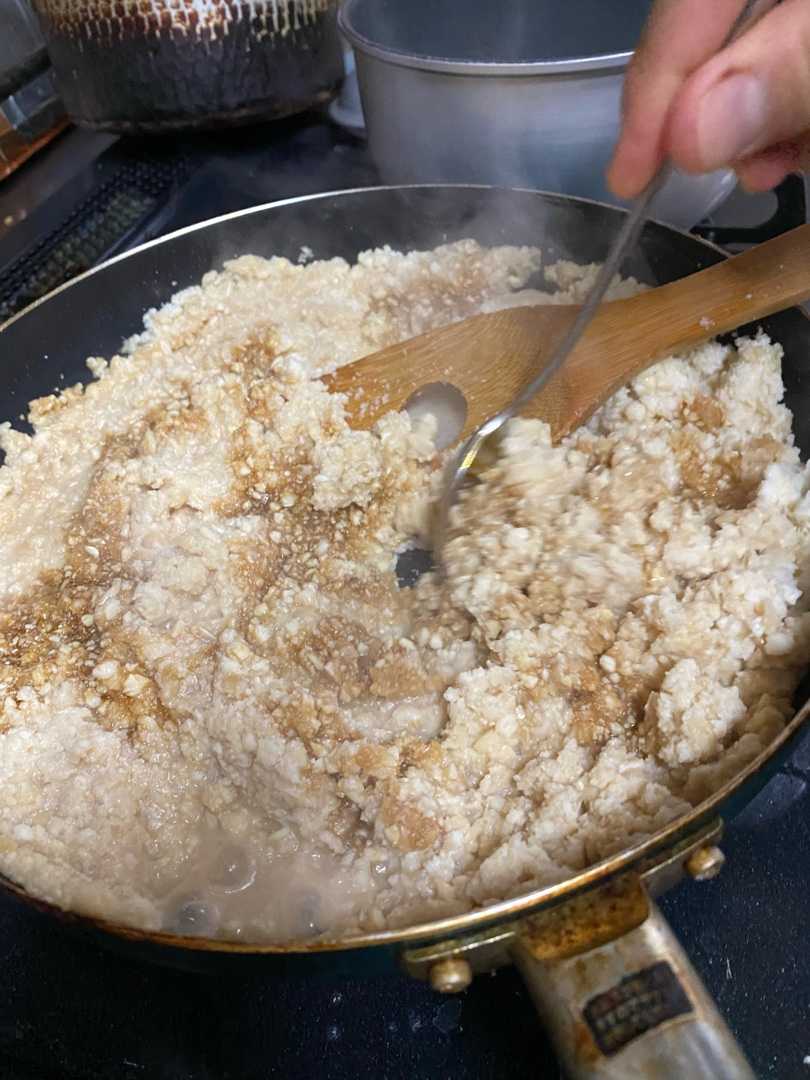 さて、絞り出したお豆腐をお鍋に戻して、やや強めの中火でかき混ぜます。