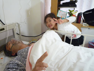 酸素マスクも痛々しくかろうじてVサイン・・・。