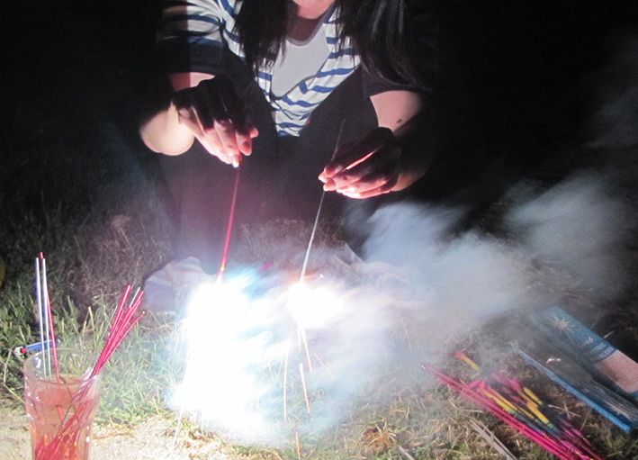 インデペンデンスディにはサンフランシスコから友達が来た。カリフォルニアの片田舎にあるこの町では、一年に一度、個人で上げる打ち上げ花火が許されるらしいので日が沈むと、そこら中で大きな花火がたくさんあがった。人生初の打ち上げ花火を。。。と計画していたが、その夕方、チャイナタウンの小道で小さな花火の束を発見。友達と一緒に、一晩では遊びきれないほどの花火を買って帰った。大きな花火でにぎわう近所の隅で、小さく開く火花を楽しむ。7ヶ月ぶりに再会した友達。そう言えば、このブログも7ヶ月ぶりの更新。。。
