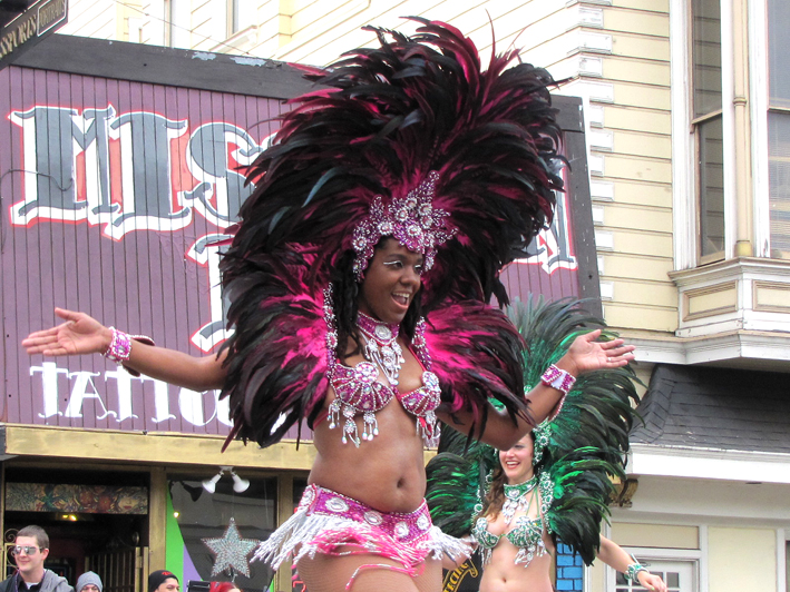 3連休の2日目、友達に誘われミッションストリートまでカーニバルを見に行く。パレードが始まるのは9時半。。。と言う事で、早起きをして出かけた。9時半から1時過ぎまで延々踊り続ける人々。彼らの体力に関心。