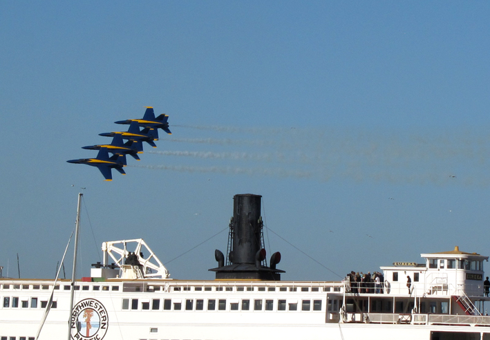 インディアンサマーももう終盤と思えるこの10月半ば。暑い!暑すぎ!!昨日、向かいに住んでるWuさんが「今日貴方の部屋を外から見たけど、こういう暑い日は窓を開けたりしちゃ駄目!カーテンを開けるなんてもってのほか」と、夜も静まり、ベッドで眠りについていた私をノックで起こしながら注意しに来た。えっ、何々?とやっとの思いでドアを開けたときに、Wuさんは既にいなくイチゴとラズべりがドアの前に置いてあった。ありがとうWuさん…。でも、こう暑くちゃもう眠れないや。仕方なく朝方まで起きる覚悟でPCに向かってみる。ディスクトップ上の写真を整理してると、2週間くらい前に行ったFleet Week の写真がでてきた。Blue Angelsのアクロバット飛行Show。あーそうだった、そうだった。いやがる友達を無理やり誘って行ったんだっけ…。「あまり興味がないし」、「日に焼けるからヤダ」、「今、頭が痛い」の究極の断り言葉も聞かなかったことにして、会場から電話を掛け続け、遂には渋々やって来た友達。残すところあと僅か15分位のShowだったけど、楽しんでもらえたのか?