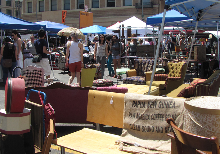 日曜の朝、ロスのダウンタウンまで蚤の市を見に行く。一週間も前から蚤の市を楽しみにしていた新しいルームメイト(家主)は、前日、私の買い物に一日中つき合ってくれたのが原因か、ソファーの上でゴロゴロしながら、”今日は、パス。。。”と手を振っていた。ごめんよぅ。この蚤の市、 地元のデザイナーやアーティストの作品もあるらしい。 ちょっと見ただけでも欲しい物が一杯だったのに、キャッシュの持ち合わせが無く、泣く泣く断念。トホホ。あの赤い靴、来月もまだあるのかなぁ。。。