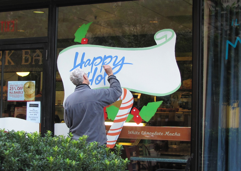 個人的に盛り上がったサンクスギビングも終わり、街全体がホリデーシーズン一色。日本では夏の花のイメージが強いひまわりが、カリフォルニアでは秋のイメージで飾られるので、ここ数日、大量のひまわりを買い込んでいた。サンクスギビングの前日、フェリービルディングのファーマーズマーケットの花屋に足を運ぶとベーカリーのウインドウにペイントしているのを発見!ハロウインには可愛いらしいパンプキンの絵、ホリデーシーズンにはクリスマスのイメージいつもいつも絵が変わって、通りを歩くだけで気持ちがホッコリしてしまう。
