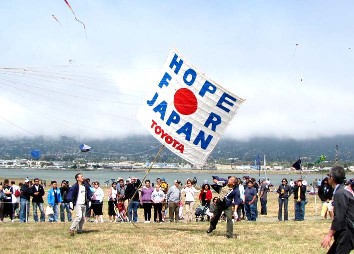 風について調べてみると、風(かぜ)とは、空気の流れの意味らしい。逆に、凪という字は几に止まるで「なぎ」。全く風の無い状態。それじゃあ、凧は几に巾で、空気の流れの中で巾を利かせているのか…と感心したりする。そういう話ではなく…。今日見に行った、バークレーカイトフェスティバル。いつもお世話になっているIATA(浜松の大凧を揚げる団体)が参加している、かなり大掛かりな凧フェスティバルなのだ。IATAは全てがノンプロフィット、つまりボランティア活動で成り立っているので、本当に凧揚げにロマンを持っている人達だけで運営されている。まず、スポンサーを捜し、広告を打ち、自分達で凧を作り、人を呼ぶ。これが結構、大変な仕事になる。凧揚げに漕ぎ着けたからといっても成功という事ではない。去年はフェスティバル2日めにして、2枚の大凧が海の中へ。今年も、フェスティバル目前にして、全ての凧を保管してあったガレージが大火事。もちろん、凧は全焼。今年のフェスティバルには不参加なのかな…と思っていると、やっぱり彼らは新しい凧を用意し風に乗せ、高く高く揚げるのだった。どんな逆風が吹いても諦めない人達。向かってくる全ての風は凧を揚げる良いチャンスだなんて…。大空の中、風に乗っている凧を見ながら、眩しいという表情と共に自分自身に渇を入れた。