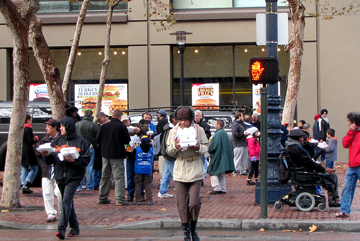 遂にサンクスギビング週間。4日間のお休みも嬉しいけど、いつもこの時期は風邪を引いてダウンしてしまう。それでも、仕事上やらなきゃいけない事もいっぱい残してるので咳き込みながらも仕事へ向かう。歩いてる途中で、ボランティアの人達がホームレスや低所得者対象に、食べ物を配っているのに出くわす。サンクスギビングは年に一度、家族や親戚一同が集まって七面鳥や野菜を前に、神様へ収穫の感謝をするという、家族団欒のひと時なんだけど、アメリカ人はパーティー好きなのか、家族のほかに一人、二人のゲストを交えたりする。たまに呼ばれていくサンクスギビングの食事も最初は珍しく楽しかったけど、殆ど知らない人達の間でする食事は、年を重ねるごとに苦痛にもなってきた。道端で嬉しそうに、もらった食べ物を食べているホームレスたちの光景は本当に幸せそうで形はどうであれ、私はそういうサンクスギビングの方が純粋に楽しめると思ってしまう。こんな曲がった見方も、熱が出始めた故なのか…。