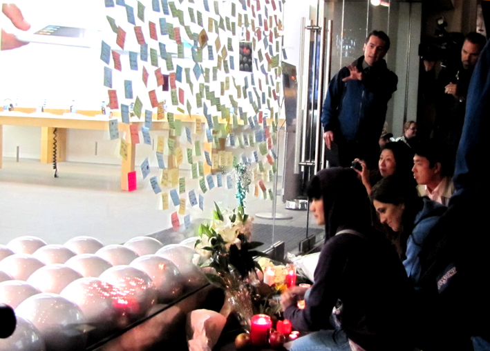 大きな嵐が来ると言われていた今日、一滴の雨が降ることもなく一日が終わろうとしていた。そろそろ帰り支度を始め、持ってきた傘を握り締めた途端、その速報は流れてきた。かつて台風の目とも呼ばれた偉大なクリエーターがこの世を去ったという事。歴史をあっという間に塗り替えたジョブズ氏の功績はあまりにも大きく56歳という年齢を考えると、まだまだ未来にアップル旋風を巻き起こしていたのではと思えてならない。一度も開かなかった傘の先をつま先で蹴りながら、アップル社のショウルームの前まで来ると大きな人垣ができていた。ウインドウにハート型に張られたポストイットのメモ書には、一枚一枚にありがとうの言葉が書きしるされ、ツイッターで人数も増えハートはどんどん大きくなっていく。これもジョブズ氏が作ったデジタル世代の感謝、追悼の表現なんだと感心した夜。