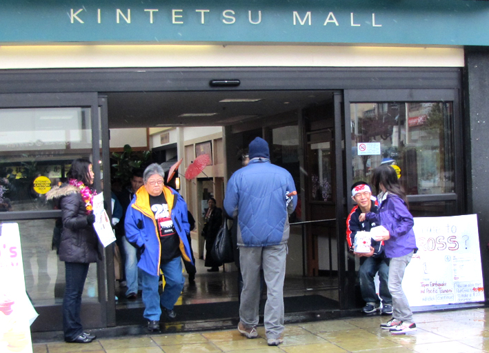先週から続く雨。一部では強風雨+竜巻警報も出ていた。日本の事が書いてある新聞が読みたくて、土曜になった途端に日本町に行ってみた。ビルの入り口から聞こえてきた日本の曲。近づいてみると日本の被災地へ向けての募金だった。雨の中なのに…がんばってますよ。こちらでも。私も、日本円で参加させてもらいます。(円高続いてるんで…)(写真には2人しか写ってませんが、募金を呼びかけていたのは日本人だけではない5,6人の有志の集まりでした。全員が写真に入らなくてゴメンナサイ)
