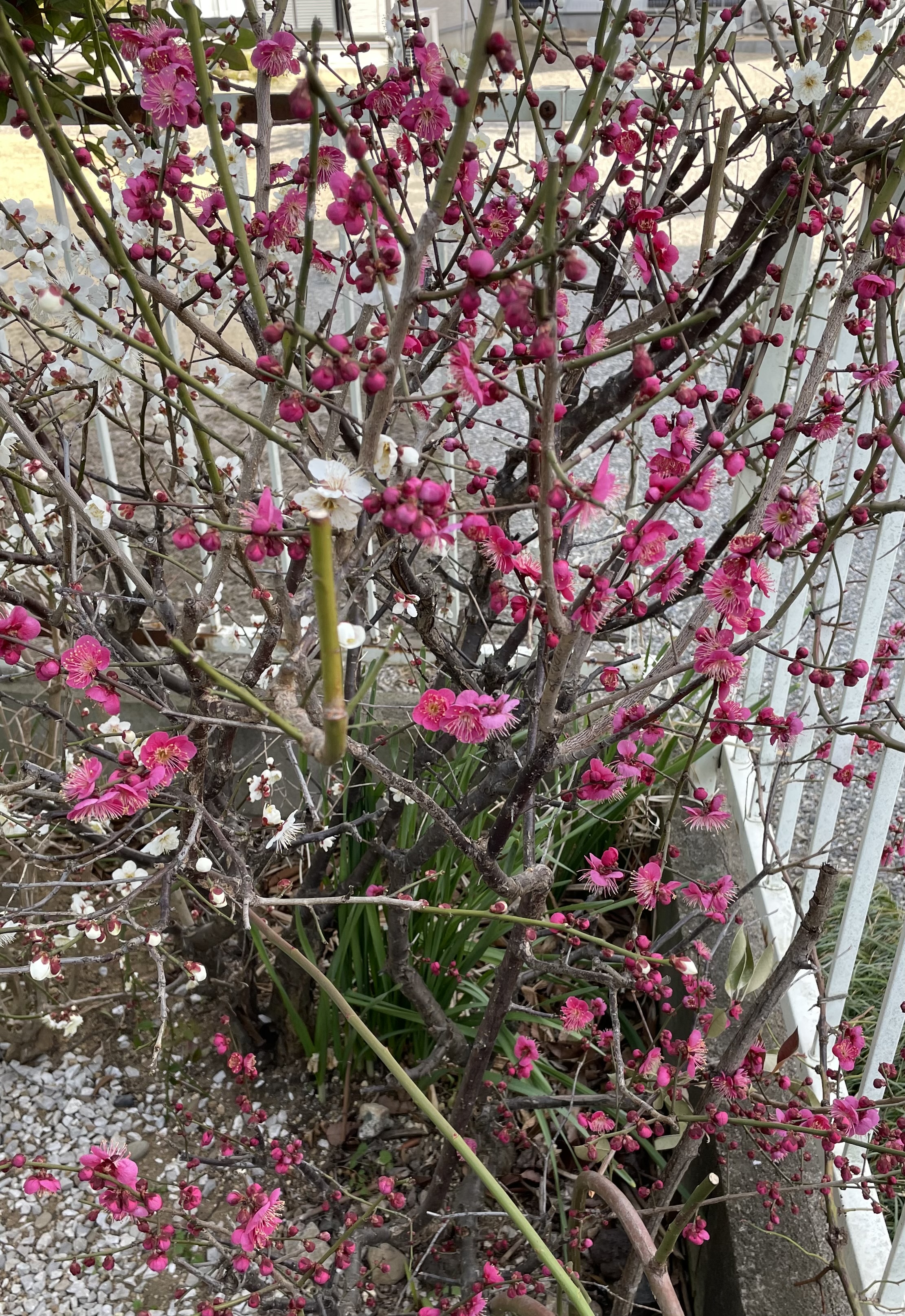 我が家の梅大分開花して来ました。白梅、紅梅とも盆栽梅です🪴大きくなり過ぎた😅どちらも地植えにした。地植えでも大きくならない様に😅秋には強い剪定してます。今年は今まで以上に花数多い🌸🌸😊盆栽梅なのに実も付けます😅たくさん成るかな😊