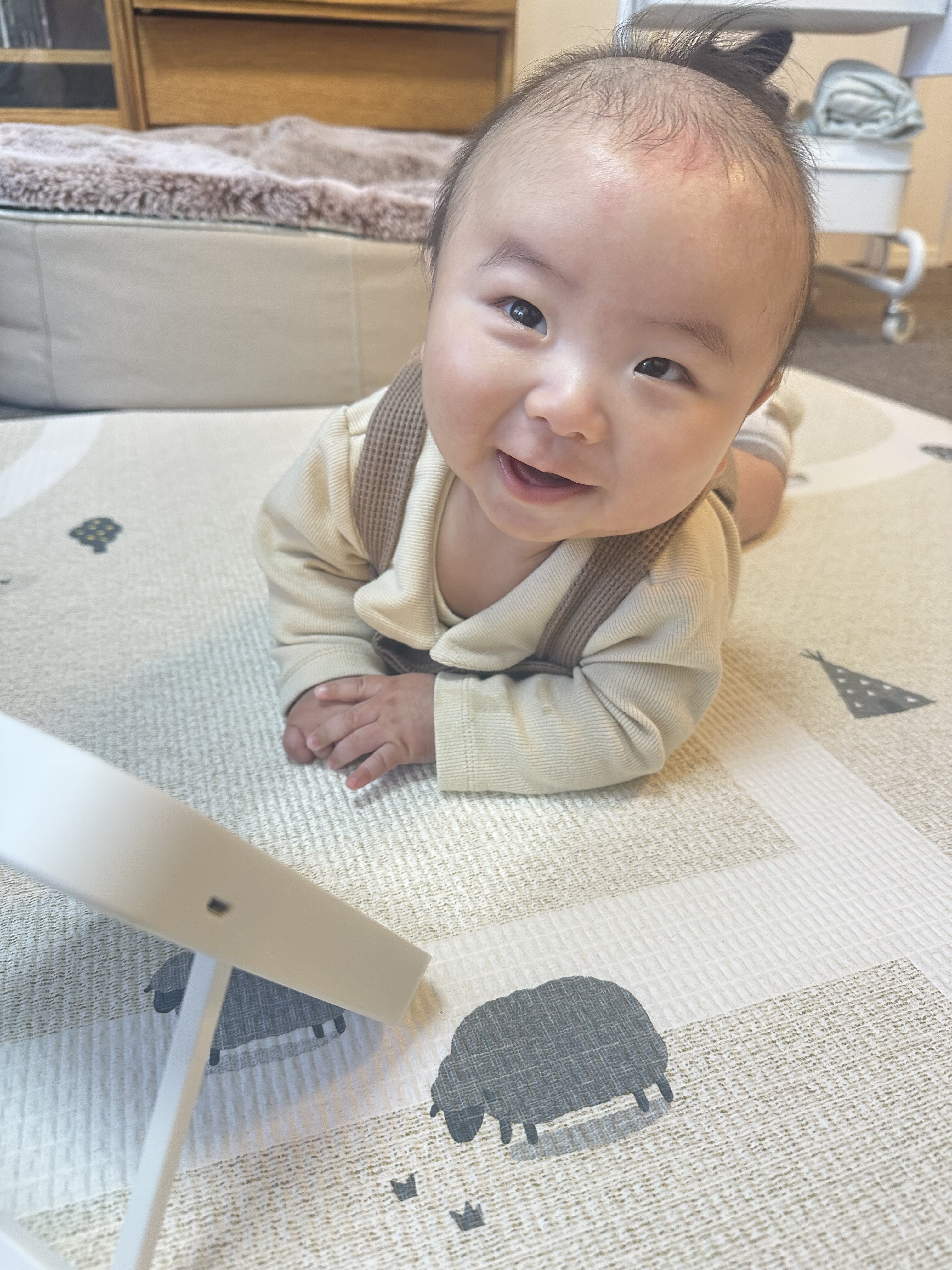 送られて来る写真。みてねのアプリで見れる。便利な時代になった。頭を持ち上げてる。しっかりと首が据わったかな?ハイハイは何時頃始めるかな?カガミをのぞいてる?向こうにいるのは誰かな?合図を送ってる!立派な椅子に座ってる?楽ちんそうだ。気持ち良さそう!ROOMにも遊び来て下さい。