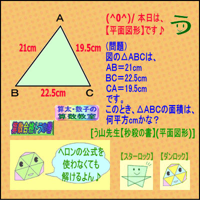 [算数合格]【算太・数子】(平面図形・面白問題)*---------------------*【算数合格トラの巻】【算太・数子の算数教室】(R)*---------------------*(o^-')b 本日はこの問題にチャレンジ☆平面図形の面白いです♪ *---------------------* (^0^)/ 本日は、【平面図形】です♪ (問題)図の△ABCは、AB=21cmBC=22.5cmCA=19.5cmです。このとき、△ABCの面積は、何平方cmかな? [う山先生【秒殺の書】(平面図形編)] *---------------------* (*^ー^)ノ平面図形の面白い問題ですよ☆ どうして面白いのか!?【ダンロック】君も言ってます、『ヘロンの定理』は高校生の公式です。 一見、この公式を使わないと解けないようですが・・・大学生の家庭教師とかですと、「ああ、これはヘロンの公式で解くんです!」とチョッピリ鼻高々に言いそうですが・・・ そんなことありません!(^^)中学受験の算数で解けますよ☆今週、一緒に勉強した人は納得してくれてますよね♪ ちょこっと工夫すれば楽勝かも知れません。君の才能がひらめくかな?(o^-')b 制限時間は、15分以内です。いろいろ考えてみてね! う山先生の予想正答率は、この時期ですと、15%以下です。 ではレッツ・ゴー!!☆(^o^)/ 答えは、本日中(2011-02-27)に解答専用メールにご連絡あった方に解答を送信致します☆解けなくても、「解答希望」でOKです☆ [解答専用メール]sansu_gokaku@hotmail.co.jp 答えは、[●●●]です *---------------------*中学受験・受験算数算数・プロ家庭教師・算数個人指導*---------------------*□□□□□□□□□□□□□□□□□□□□□□□□□□□□□□[発行者氏名] う山雄一[発行者web] 【算数合格トラの巻】 [著作] 【算太・数子の算数教室】(R) [著作] 【算遊記】 【算遊記】(geo) [仕事URL] http://www2.to/sansu [メール] sansu_gokaku@hotmail.com [ブログ] 【算数合格トラの巻】(アメブロ) [ブログ] 【算数合格トラの巻】(ヤフー) [ブログ] 【算太・数子の算数教室】(R)(アメブロ) □□□□□□□□□□□□□□□□□□□□□□□□□□□□□□ ☆
